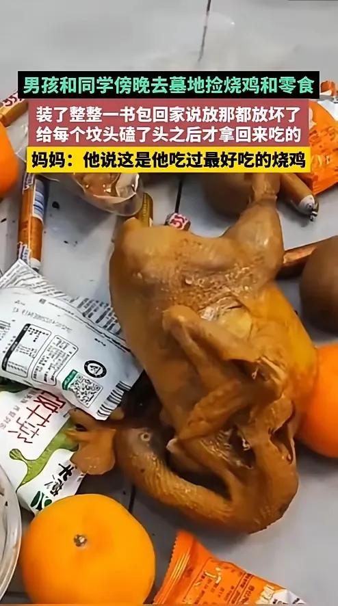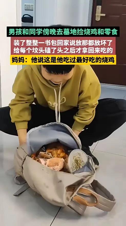 小男孩捡了一书包的贡品回家[捂脸][捂脸]傍晚他跟同学去墓地,捡了祭祖剩下的烧鸡