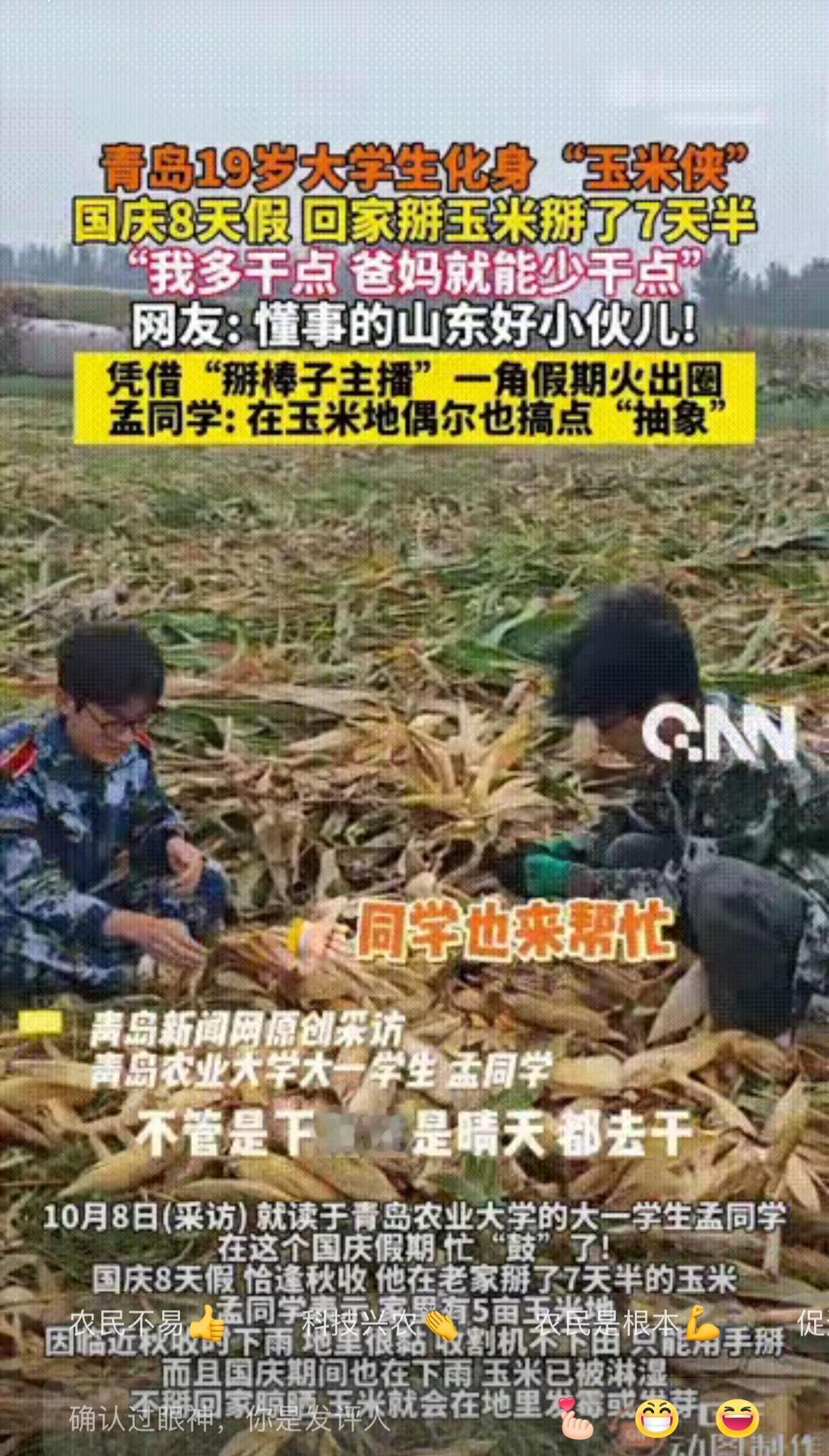 “太懂事了!”近日,山东青岛农业大学的一名大一男生,趁着国庆放假8天回家,因为父母在街上摆摊卖水果,无法离开摊位,而田里的玉米又急着秋收,于是他便一个人去田里收玉米,期间还叫了两个同学帮忙,足足干了7天半的活。 山东青岛农业大学的大一男生小李,趁着国庆的8天假期回到老家。 家里平日里热闹的街头摊位,此刻父母依旧坚守着,他们在街上卖水果,来来往往的顾客让父母离不开摊位。 小李看着父母忙碌的身影,心里有些愧疚,却也明白眼下家里的农活急不得。 田里的玉米已经成熟,金黄饱满,稍不及时收割就容易倒伏、霉烂。 一想到这些,他就下定决心自己去干。 一大早小李背着收割工具,提着麻袋,沿着泥泞的小路走进自家玉米地。 为了加快收割进度,小李还叫来了两个同学帮忙。他们从早上天刚亮就开始干活,一直到晚上天黑才停下,每天都累得腰酸背痛,但三人互相打气,一边干活一边开玩笑缓解疲劳。 小李负责带领,安排每个人的工作区域,还要搬运麻袋、整理堆放,每一环都亲力亲为,不敢马虎。 这七天半的时间里,田间的太阳几乎每天都像火一样烤着他们,汗水浸透了衣服,手上磨出了老茧,脚下的泥土被踩得硬硬的。 但每当把一袋袋玉米搬到院子里,看着满满一堆堆金黄的玉米棒,小李心里就充满了成就感。 他有时候干到晚上11点,昏黄的手电筒照亮田间,仍然认真地把最后几根玉米一根根整理好。 终于,五亩地的玉米全部收完了。 小李坐在堆满玉米的院子边,擦了擦满头的汗水,心里觉得累是累了点,但更多的是踏实和开心。 他对自己说:“多干一点,爸妈就能少操心一点,家里的事情我能帮上忙就好。” 视频发到网上后,网友们看了都纷纷点赞和评论:“这男孩太孝顺了!别的孩子国庆都去旅游了,他却帮家里干活。”、“辛苦又暖心,真是好样的!”、“这样的孩子才叫懂事,家里有你真幸运。” 这段经历不仅让小李体会到劳动的辛苦,也让他更深刻地理解了父母平日付出的艰辛,同时也用行动传递了责任和孝心,让看到视频的人都感到暖意。 还有网友也表示这叫责任,父母养我们小是责任,我们养父母老更是责任,做人得有责任感!