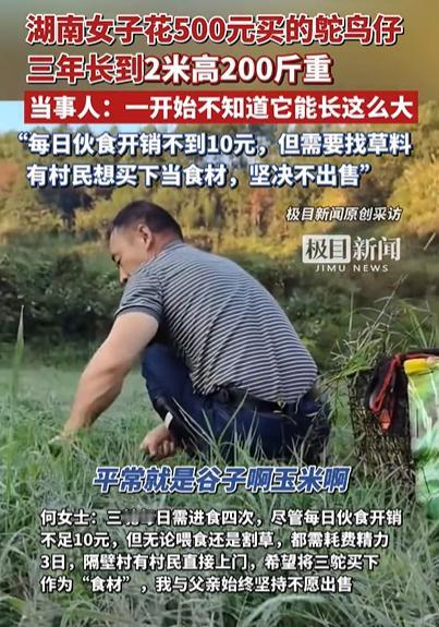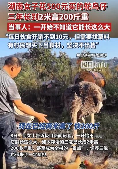 湖南一名女子在三年前养了一只鸵鸟,没想到现在已经长成了两米高、两百多斤重的“巨无霸”,鸵鸟和家里已经有深厚的感情,但是照料鸵鸟困难,女子的妈妈和奶奶都想把鸵鸟卖掉,女子无奈,只好上网求助如何安置鸵鸟。 极目新闻10月7日的一篇报道引起了热议,网友也纷纷表示时间长了都有感情,留着吧当宠物养着! 2022年夏天的一天,天刚热起来,街上人来人往,何女士(化名)下班回家的路上,看见路边摆着个铁笼子,里面蹦蹦跳跳的几只小家伙。 她凑近一看,竟是几只毛茸茸的小鸵鸟,个头比鸡大点儿,脖子细长,脑袋圆圆的,眼睛滴溜溜直转,看起来挺机灵。 摊主见她感兴趣,赶紧招呼:“新出壳没多久的鸵鸟仔,挺好养,一只500块,吃玉米糊、菜叶子就行,长得快着呢!” 何女士蹲下来,伸手隔着笼子摸了摸小鸵鸟的脑袋,手感软乎乎的,小家伙还歪着头看她,一点都不怕人。她心里一动,想着反正家里地方大,父亲平时也养鸡养鸭,再添几只也不麻烦。 她拿手机给父亲打了个电话,问:“爸,这鸵鸟能养吗?” 电话那头的老何笑着说:“鸵鸟?那玩意能养就养呗,咱家山后那块空地不还闲着吗?” 何女士一听,心里也就定了,当场掏了钱,挑了三只活蹦乱跳的带回家。 一家人看着这三只新成员,谁都觉得稀罕。 母亲乐呵呵地说:“这不比鸡鸭有意思多了,养好了还能当宠物呢!” 第二天,何女士和父亲就在后山的小空地上围了个栅栏,撒了点玉米粒,又搭了个简易的棚子遮雨。三只鸵鸟放进去后,立马跑得欢,一会儿啄草,一会儿追着鸡鸭满地跑,闹得家里热热闹闹的。 起初,谁也没太当回事,只觉得这就是几只“长腿版”的家禽。邻居来串门,还打趣说:“这要是下蛋了,估计一个蛋得够咱仨吃一顿吧?” 何女士听了笑着摆手:“哪有那么快,先养着玩呗,看它们能长成啥样。” 不到两个月,何女士家那三只鸵鸟仔的情况就不太妙了。起初还活蹦乱跳的,后来不知道是天气太潮,还是喂食不当,一只接着一只出事:有的病了趴在地上不动,有的撞到围栏受伤,折腾了好几次,最后就剩下一只。 那天清早,何女士去喂食,看着地上空出来的地方,心里一阵不是滋味。她蹲下来,摸了摸仅剩的那只小鸵鸟的脖子,叹了口气:“就剩咱俩了,可得好好活下去啊。” 从那以后,她对这只鸵鸟格外上心。每天早晚都要去看一眼,换水、添料,天热还特地给它搭了个遮阴棚。父亲一开始还打趣说:“你这是把它当闺女养啊?”她笑笑没反驳,心里却是真心疼它。 可谁能想到,这小家伙长得惊人。 到了年底,脖子越伸越长,腿比人还粗,个头眼看着蹿到了两米多高,体重也飙到了二百来斤。走起路来咚咚直响,连狗都被吓得绕着走。 每天得喂四次,早上喂玉米糊,中午添青菜,下午割草,晚上再补点料。算下来一顿花不了多少钱,也就十块左右,但最累的是人。 光是割草、清圈舍就够她和父亲忙半天。父亲有时候累得直喘,还打趣说:“这鸵鸟吃得比咱都讲究!” 几个月前,隔壁村来了个大叔,听说她家养了只这么大的鸵鸟,特意跑上门来看。那大叔看得直咂舌:“这可真肥实!要是卖给我,我拿去做食材,价钱你开,保证不亏你。” 何女士一听,连连摆手:“不卖,这鸵鸟跟咱家时间久了,早就有感情了。” 父亲也跟着附和:“是啊,当初小不点儿的时候,咱一手喂大的,哪舍得啊。” 大叔劝了半天,见两人态度坚决,也只好笑着摇头走了。 网友也表示就当宠物养着吧!它又乖,又听话,三年时光增强了人与动物之间的情感,真的突然分别都会不舍的!
