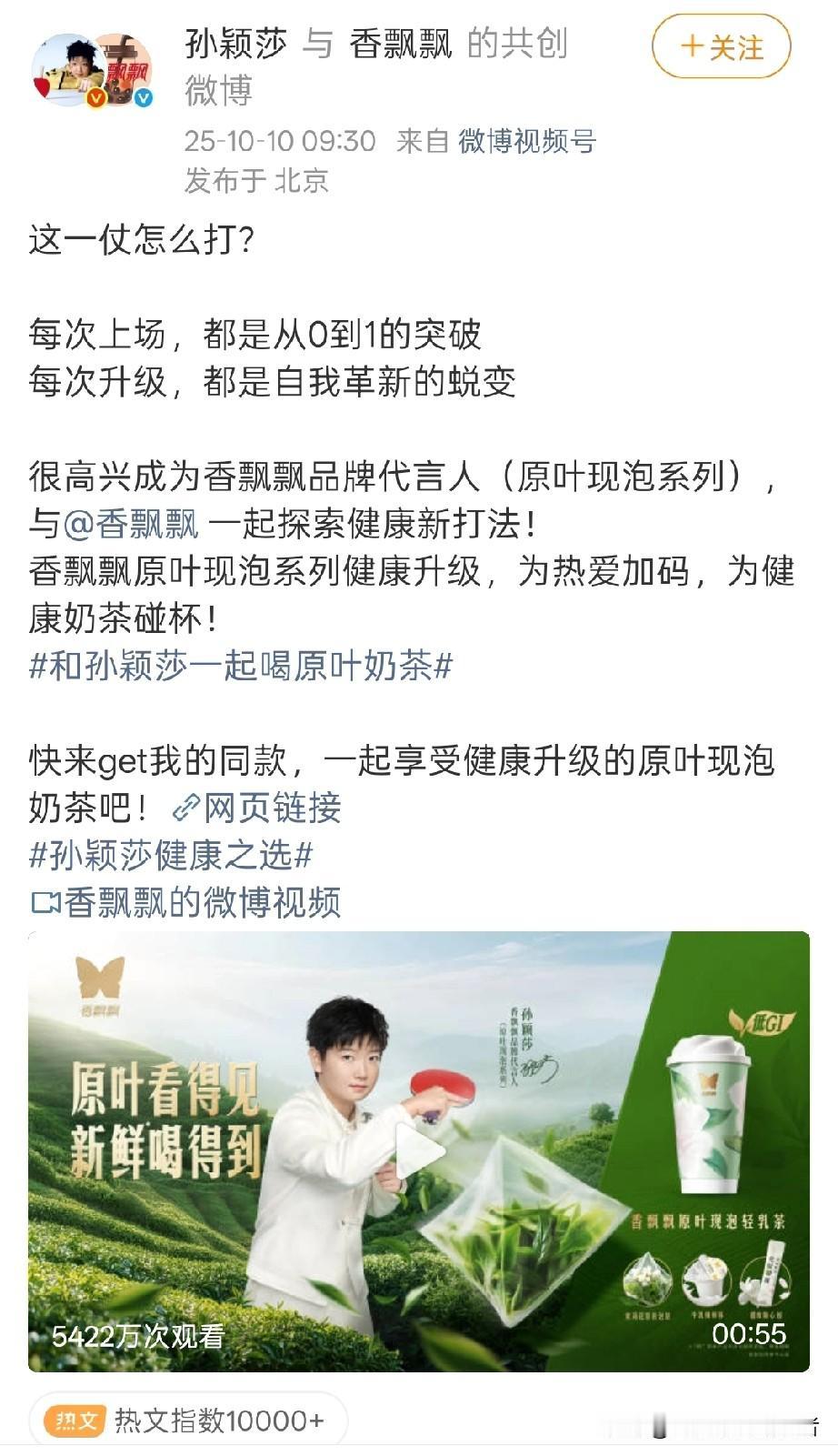 孙颖莎的新发这条微博太燃了! 刚官宣代言, 她就用一句话 道尽了运动员的热血:“这一仗怎么打?每次上场,都是从0到1的突破!” 这股拼劲,难怪香飘飘会选她做原叶现泡系列代言人。阳光、开朗、纯粹,还充满正能量,简直是为莎莎量身定做的形容词! 每次看她上场,都能感受到那种不服输的劲头。从0到1,每一步都走得踏实又坚定。这才是真正的偶像力量吧!