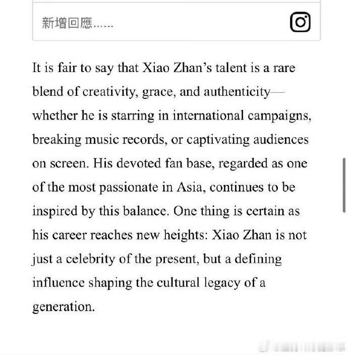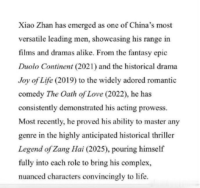 ELLE新加坡版盛赞肖战是“中国奢牌之王与当之无愧的时尚偶像”,肖战以《藏海传》等佳作展现演技实力,凭Tods等奢牌合作彰显时尚影响力,更被定义为塑造一代人文化记忆的标杆人物,在时尚与演艺领域持续闪耀,书写属于自己的时代印记。肖战
