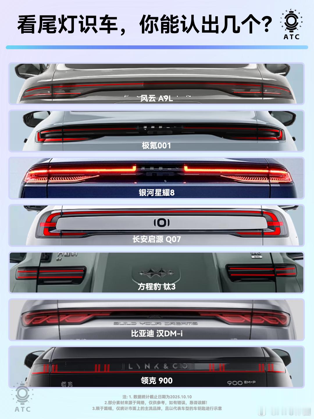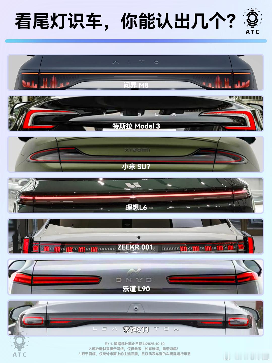 问界M8的,科技感拉满,跟品牌标放一块,很绝了;特斯拉Model 3的折线尾灯,放现在看还是够前卫,一眼就能认出来;小米SU7作为信新势力的玩家,星环尾灯设计很有格调,能看出是真用心了;理想L6的尾灯简约但不简单,家族味很浓;极氪001的像素风尾灯,在车流里绝对是独一份,个性化这块玩明白了;风云A9L大气潮流;长安启源Q07的创意挺巧妙;汉DM的“中国结”尾灯,经典到没话说;