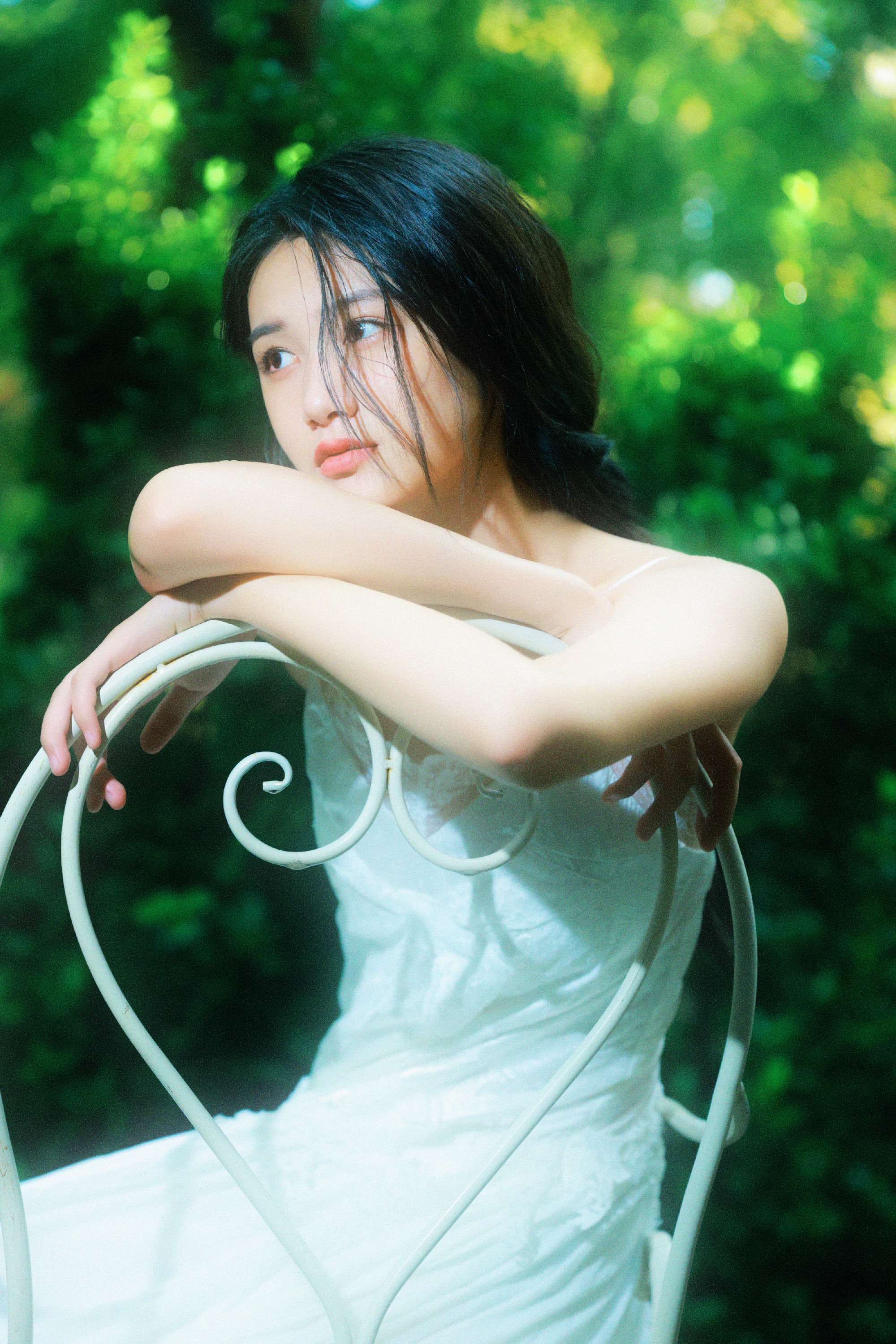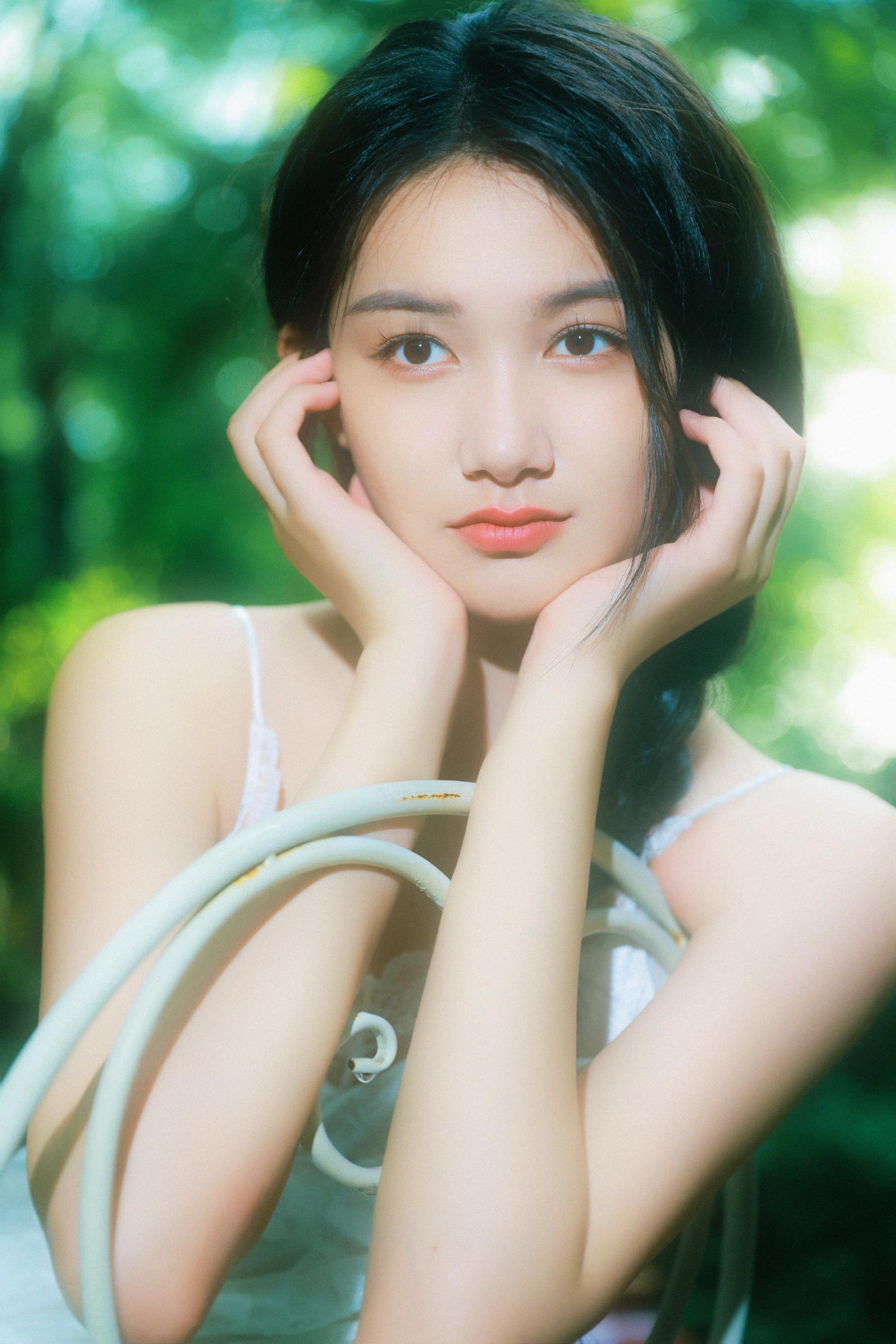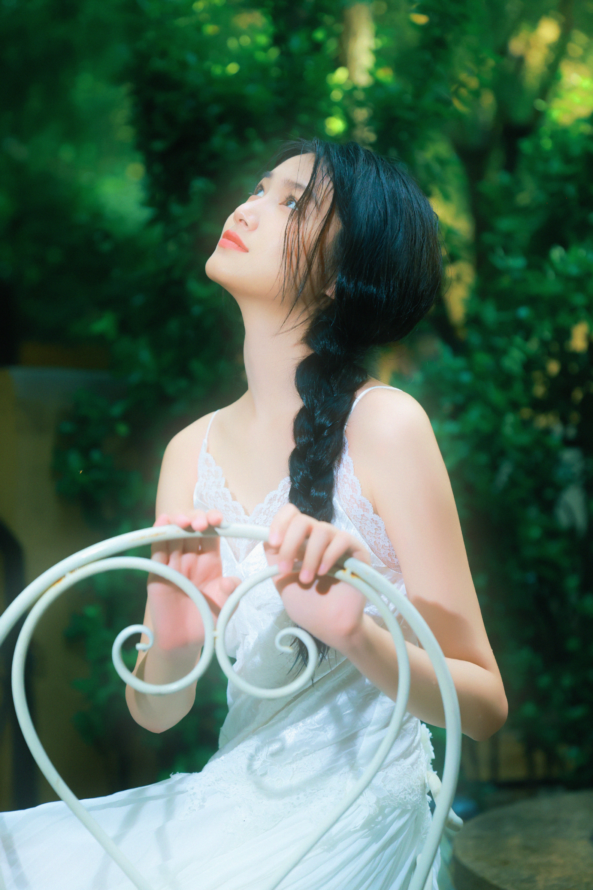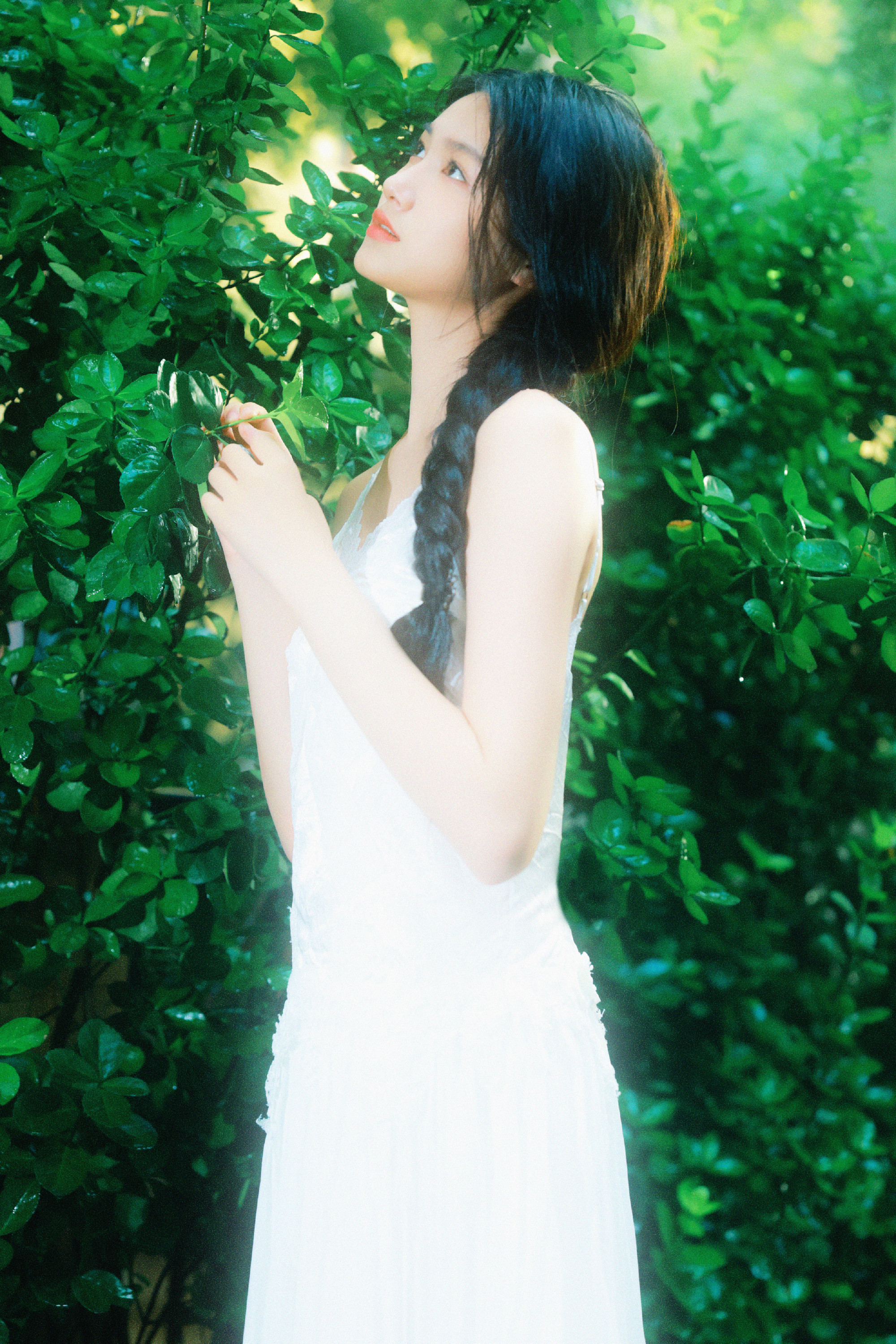 张籽沐告别盛夏写真上线,麻花辫吊带白裙,绿植林间的小仙女