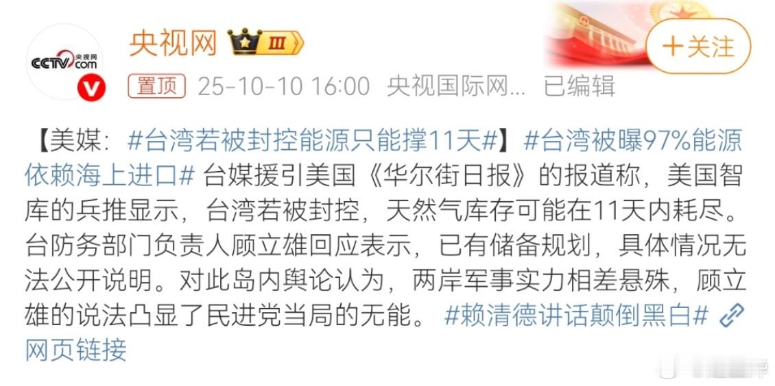 台湾省不需要能源,众所周知的,台湾可以用爱发电,而电力能够转换为驱动其他一切能源驱动的设备。因此,台湾省不怕封控,恐怕咱封它一年,也丝毫不会影响台湾同胞的生活质量!除非…台湾没了爱![哈欠] 台湾若被封控能源只能撑11天
