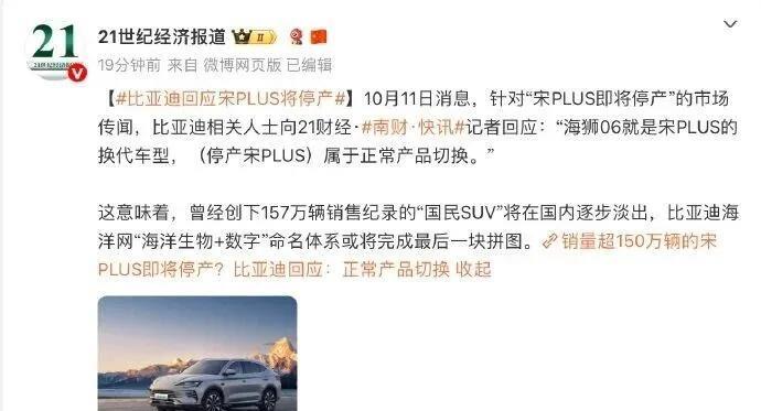 太可惜了,比亚迪宋PLUS国内即将停产,海狮06全面替代 一代神车宋plus就要停产了,想想还是有点可惜了,不过宋plus已经完成了它的使命,创下了157万辆的销量记录,常年霸榜新能源SUV第一名。 就在10月11日,比亚迪方面正式回应:“海狮06就是宋PLUS的换代车型,(停产宋PLUS)属于正常产品切换。” 虽然国内已经停产了,但在国外依旧还是有这个型号,海狮06接替宋plus。 海狮06作为平替者,也没有让大家失望,直接上市两个月,月均销量三万多台,9月更是销量达到30901台,已经慢慢的走向正轨了。 实话讲,宋plus的慢慢停产,我还是觉得很可惜的,要是能回归到王朝网就好了,和宋Pro,宋L组成一个系列,销量也会很不错的。 宋plus也是比亚迪发展历程中不可或缺的一个车型,也算是比亚迪的明星车型了。