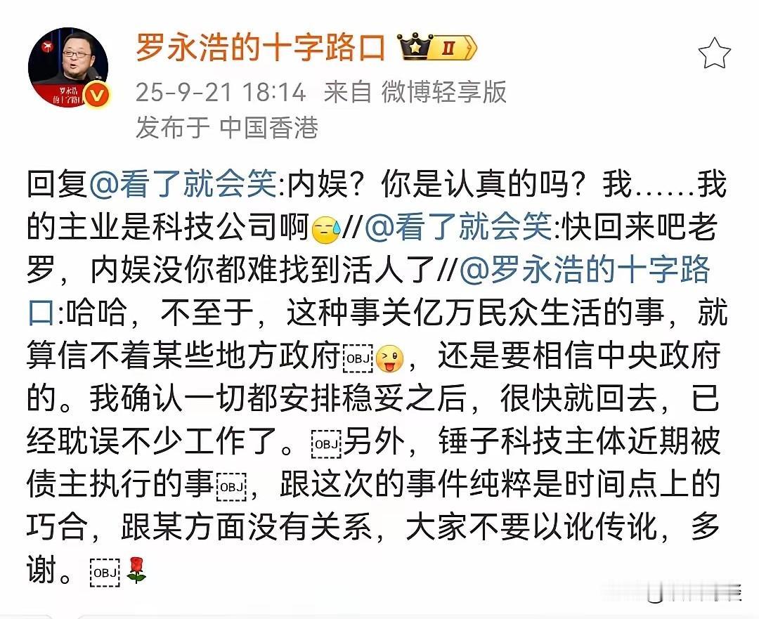 罗永浩回来了,并表示自己爱上海,这一次特别爱! 而且老罗表示自己去日本就是出个差,期间略微犹豫了一下,多待了两天。 不过最近老罗微博动态也是频繁啊,一会日本,一会香港的,而且频繁与网友互动。 澄清了自己去日本出差的事实,而且也发文称锤子科技被执行时间上纯属巧合。 虽然近期关于老罗是传言还挺多,但只能持续关注一下他自我甄别一下