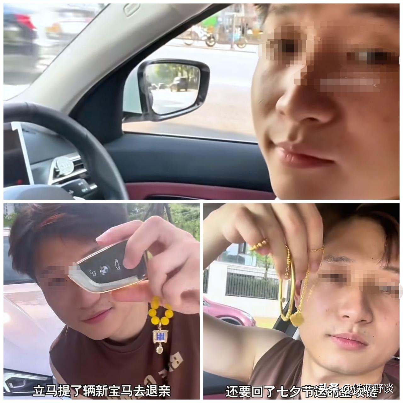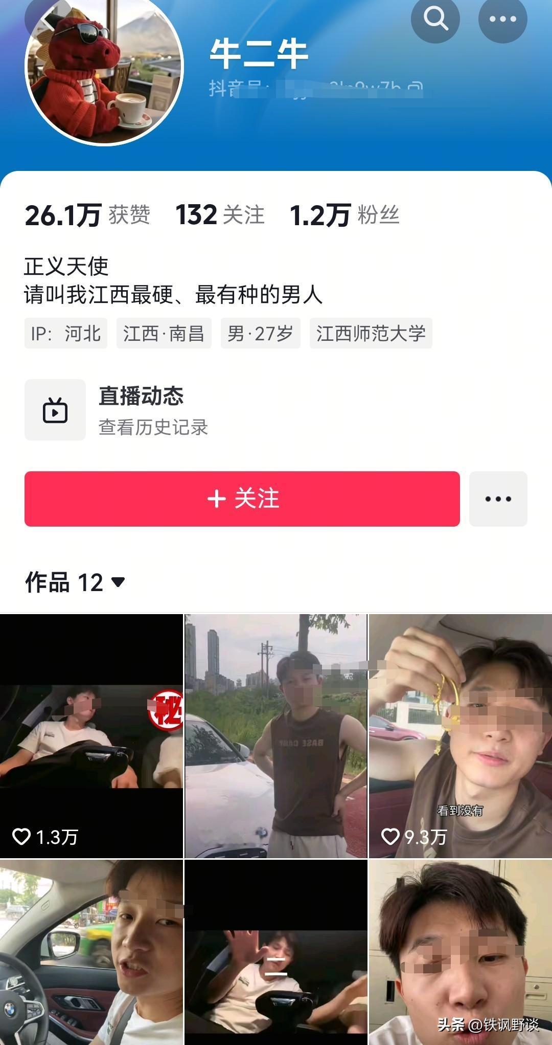 这个号称江西最硬的的男人感觉有作秀的嫌疑啊。 一个牛二牛的账号近日发视频称自己相恋6年的女友竟然开口要38.8万的彩礼。 虽然还男子试图说服对方少要一点,但似乎再多的交流已然无济于事, 按其女友的说法是,这个彩礼已然很低了,而且也是一种爱的证明,也是对她生活的保障。 两人闹翻之后,该男子转身就是买了宝马全网炫耀,甚至还把七夕送的金首饰都要了回来。 还把自己某平台账号的签名改为: 正义天使!请叫我江西最硬,最有种的男人! 不过,如此高调的确有点起号引流的嫌疑,毕竟谁跟自己女朋友聊天,还录着视频。 现在这个牛二牛账号粉丝已上万,如果又是像“女子嫁到外国平民窟求助回国”那样摆拍的话,这种账号还是尽快封掉吧。 我们拭目以待看看后续