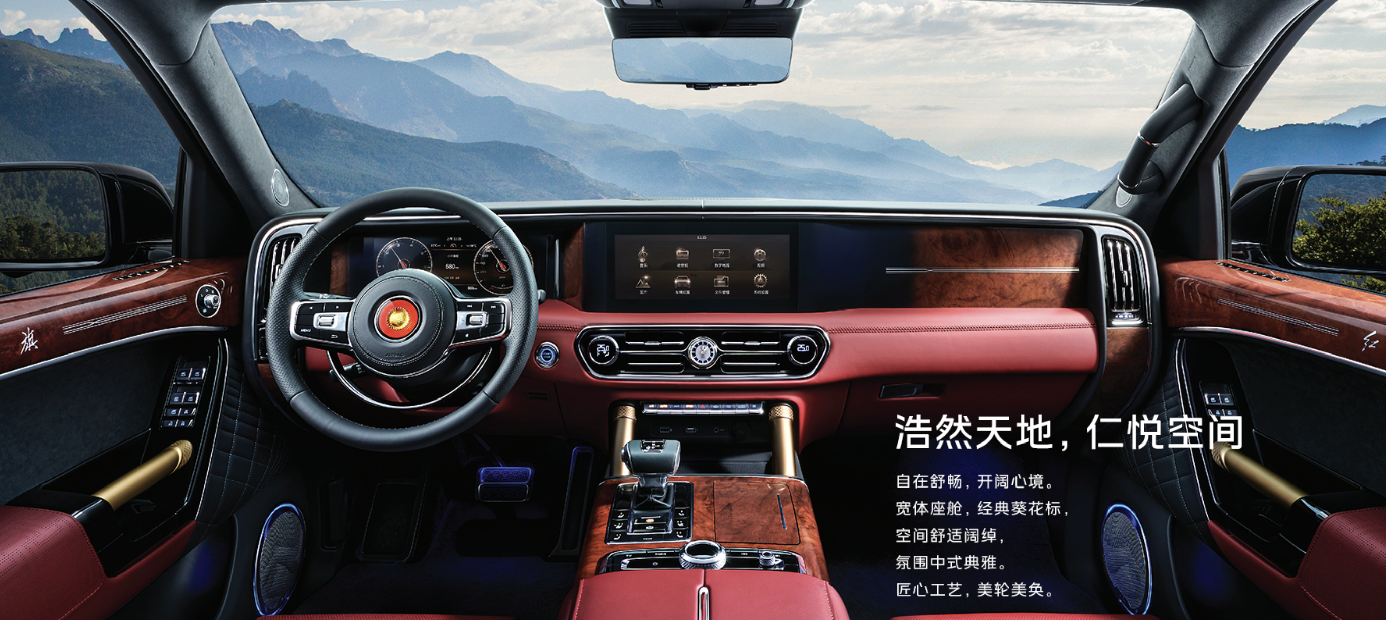 新车延续了红旗品牌的经典设计语言,前脸是标志性的大尺寸直瀑式进气格栅和贯穿引擎盖的红色旗标,搭配“龙睛”造型LED大灯。车身长度接近5.7米,标配22英寸密条辐镀铬轮圈,并提供丹砂黑、东方白等多种单色及双色车身可选。