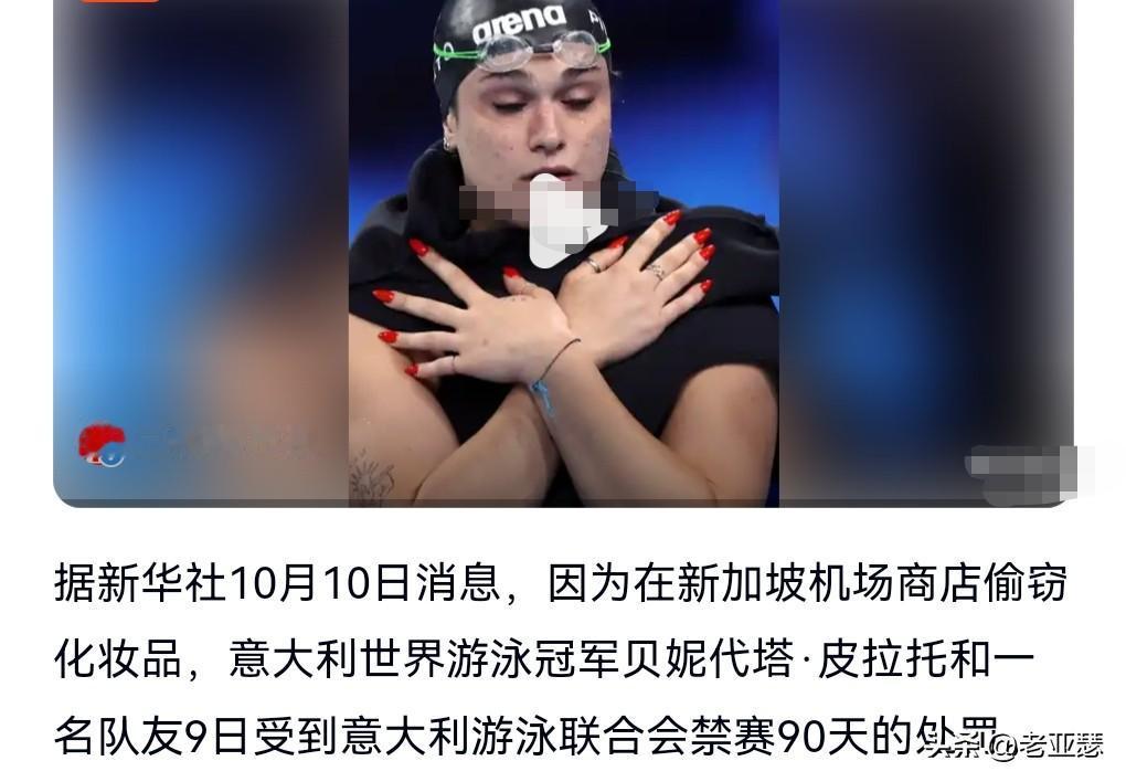 这真是丢人丢到国外。 想不到这个世界游泳冠军的人品这么差劲,竟然在机场行窃,而且被曝光后还矢口否认。 近日,其和队友受到90天禁赛的处罚。 这真的是大快人心。 就是要让这样的缺德者,在名声和事业上遭受损失。 偷东西是一种非常恶劣的行为,这是一种人品败坏的表现。 这真是德不配位。 这样的世界冠军得不到大家的尊敬。