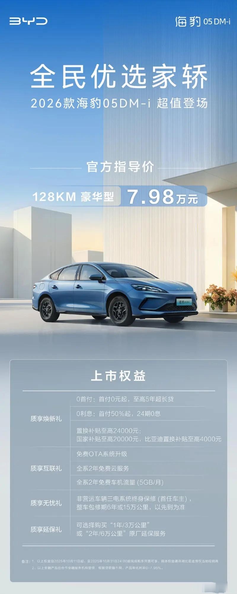懂车之道讯10月11日,比亚迪宣布2026款海豹05DM-i128KM豪华型