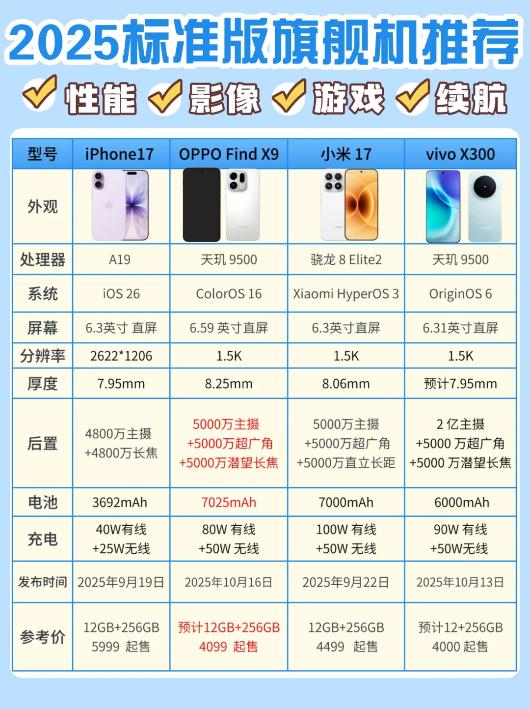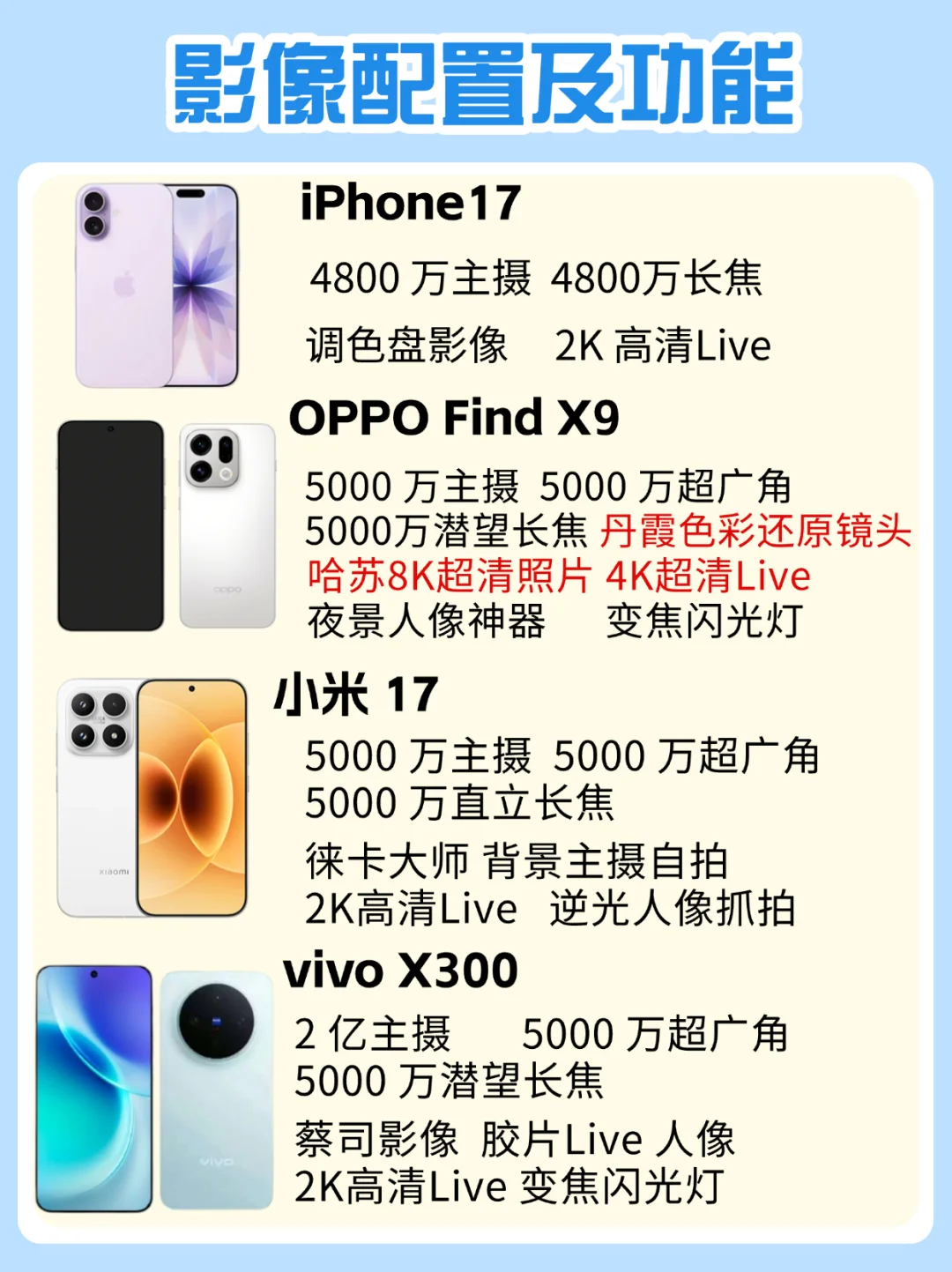 📸【影像】 iPhone17:4800万双摄+2K Live,色彩自然,视频稳,但缺长焦,远景稍吃力。 OPPO Find X9:5000万三摄+丹霞色彩还原镜头+4K Live+哈苏8K,人像夜景更强,Live图还可直发。 小米17:徕卡调色+直立长焦,色彩浓郁,抓拍快,长焦微距可玩性高。 -vivo X300:2亿主摄+蔡司镜头,解析力最强,胶片人像氛围感足,逆光HDR稳。 🔋【续航】 iPhone17:3692 mAh,iOS优化好,中轻度用户一天够;重度需带宝。 OPPO Find X9:7025 mAh,实测亮屏8h+,80W快充,出门无续航焦虑。 小米17:7000 mAh,100W快充,游戏党福音。 vivo X300:6000 mAh,90W快充,中规中矩。 💪【性能】 iPhone17:A19+8GB,单核无敌,游戏帧率稳,散热一般。 OPPO Find X9:天玑9500+潮汐引擎,原神720p 60帧3小时不掉帧,ColorOS 16 机圈德芙,流畅丝滑 小米17:骁龙8Elite2,跑分最高,峰值性能强,发热略大。 vivo X300:天玑9500,调校偏保守,日常流畅,极限游戏也表现不错。 🛒购买建议(按需求对号入座) 1️⃣ 想要最长续航+全面均衡→ OPPO Find X9 标准版直接享受Pro级配置体验,4K超清Live+哈苏超清8K+变焦闪光灯就是旅拍神器一拍即大片,7025mAh大电池+80W快充,影像/系统/防水全在线,,4000档“真香”。 2️⃣ 想要iOS生态+轻薄手感→ iPhone17 唯一iOS,视频防抖无敌,重量最轻,适合苹果铁粉。 3️⃣ 想要徕味滤镜+百瓦快充→ 小米17 100W回血最快,徕卡调色可玩性高,HyperOS功能丰富,性价比尚可。 4️⃣ 想要2亿高像素+蔡司色彩→ vivo X300 主摄像素最高,胶片Live氛围感强,适合爱拍照、爱后期的颜值党。