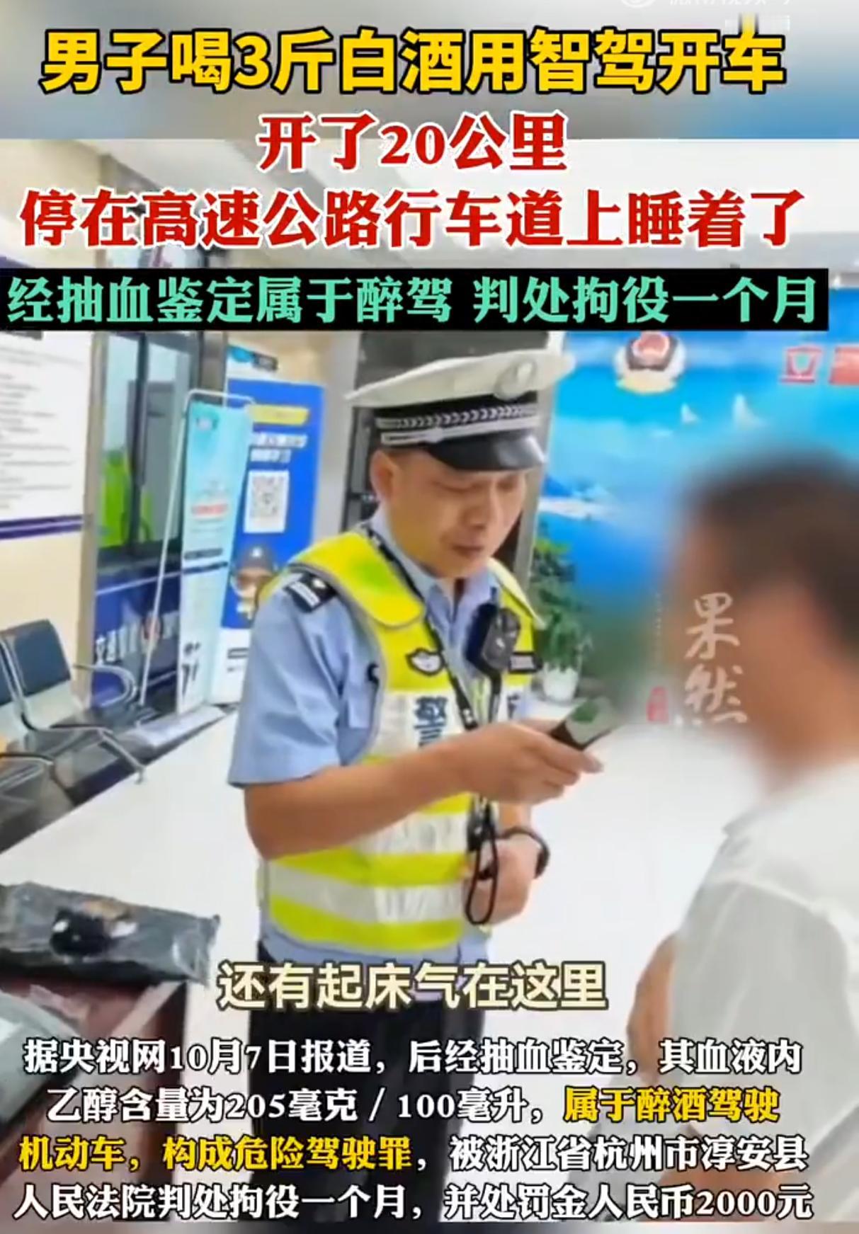 浙江杭州的一男子可真是胆大包天,喝了3斤白酒后竟然开着智驾车在高速上跑了20公里,没想到中途还睡着了。 我的天哪,这人心可真大。光这酒驾一条就够扣他驾驶分的了,还在高速上跑,高速上你能想象车速有多快啊,特别是在不清醒的状态下驾驶,这可真是不要命了。还在高速上跑了20公里! 工作人员巡查发现车停在行车道上,开车窗后酒气扑鼻,原来他想试试智能驾驶,还自作聪明觉得能躲过酒驾惩罚,可别忘了,目前智驾车大多是L0-L2级别辅助驾驶。 驾驶人必须值守,酒驾危害大,喝酒后反应也会变慢,视线模糊,这不是拿生命开玩笑吗? 结果他被罚款2000元,拘役一个月,还追究刑事责任,真是活该。大家一定要牢牢记住:喝酒不开车,开车不喝酒!