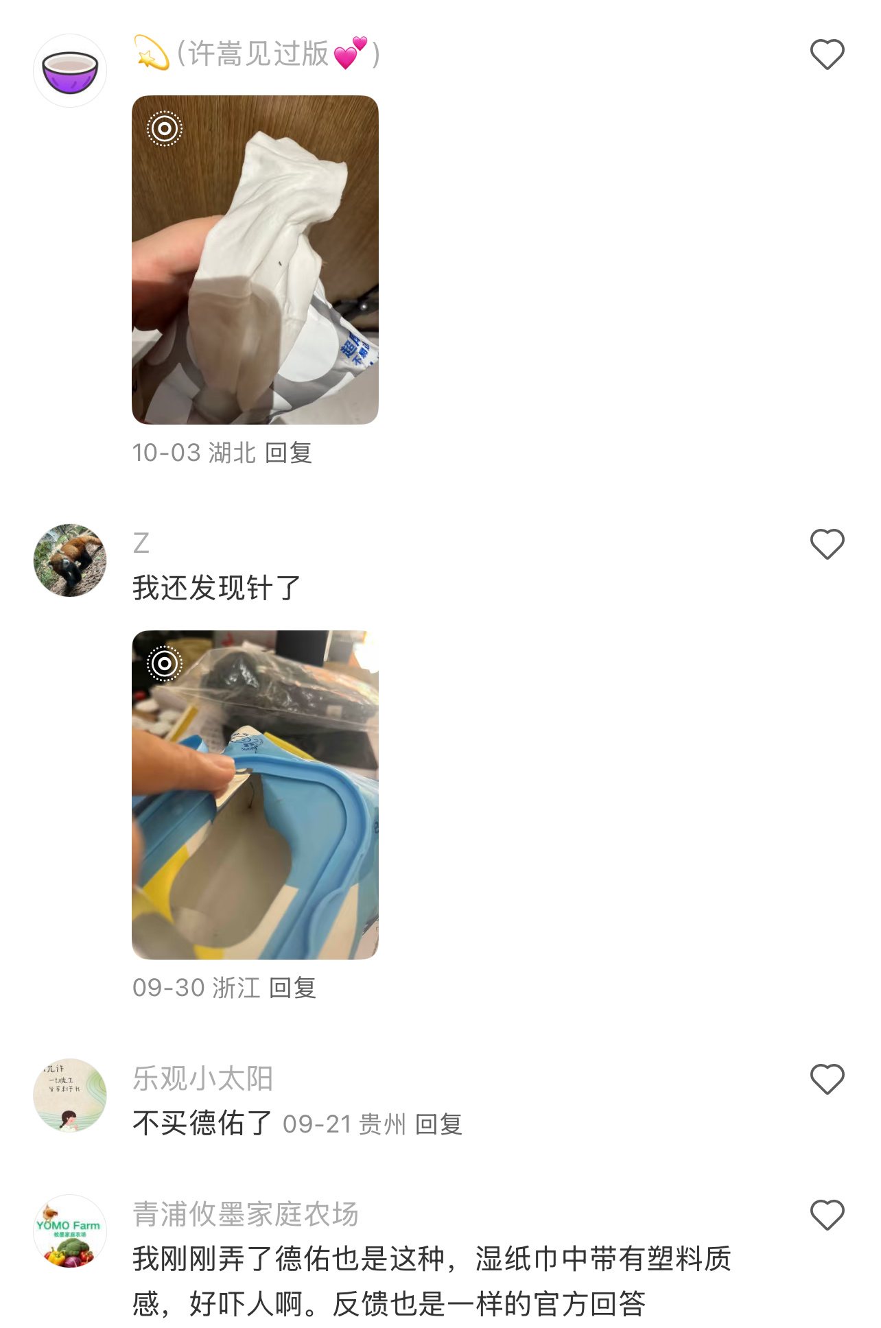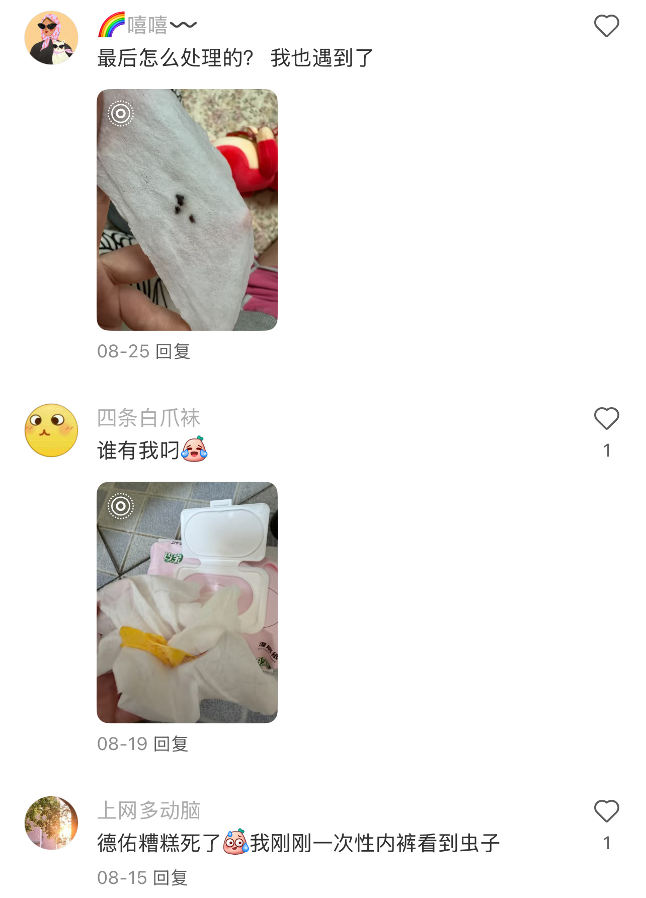 我滴妈,壁垒一个湿巾牌子叫德佑,品控也太差了吧[哆啦A梦害怕]安心裤有虫子,湿巾里面发现各种异物,贴身穿戴和擦拭的东西要是要选大牌子比较好!
