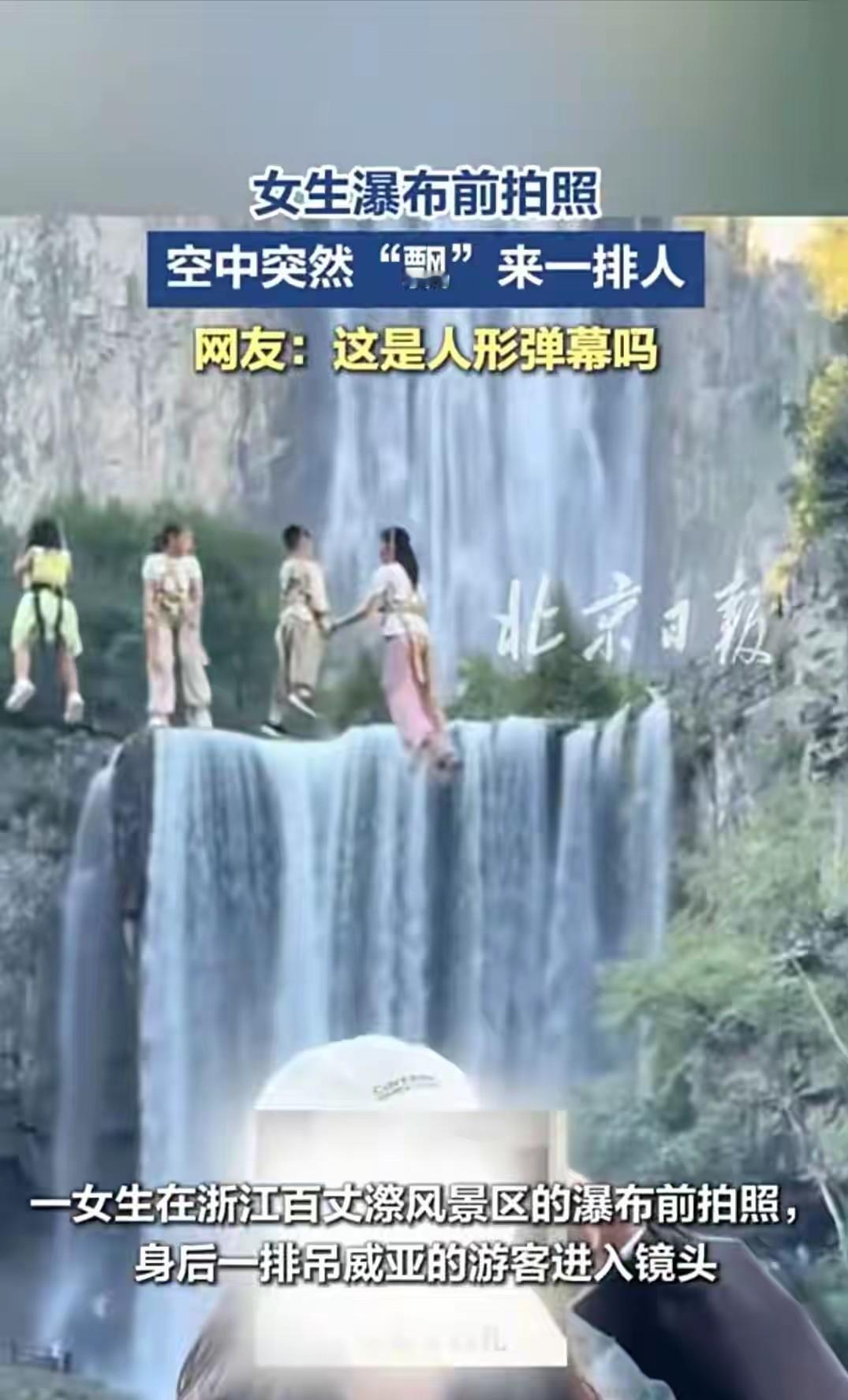 这位女生在百丈漈瀑布前拍照时,没想到会遇到“人形弹幕”事件,成为了网络热议的焦点