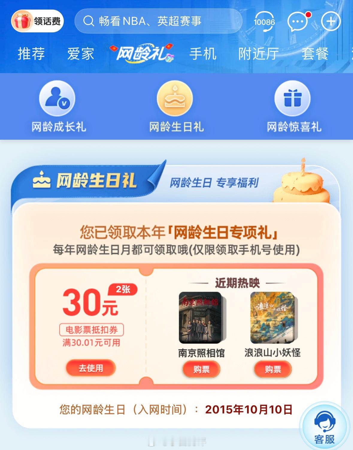 中国移动V5用户10年网龄领了2张30元电影票抵扣券[doge]