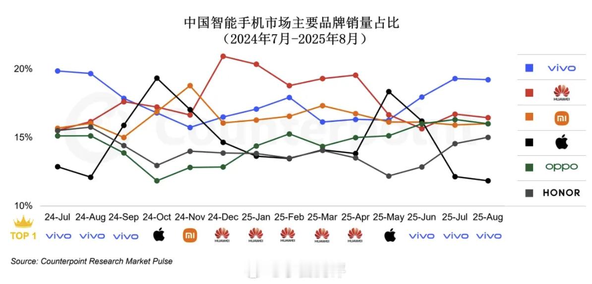 图1 Counterpoint发的2024年7月-2025年8月中国智能手机市场销量占比头部厂商份额变化折线图