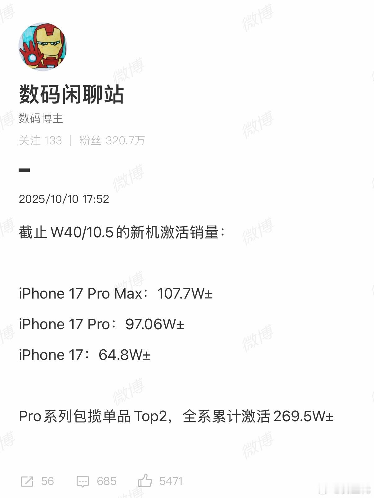 iPhone17系列激活量曝光我以为今年iPhone 17标准版会卖爆的,毕竟256GB起步,屏幕规格也和Pro一样。现在看来升级那么多好像不如Pro改个外观?[笑cry]