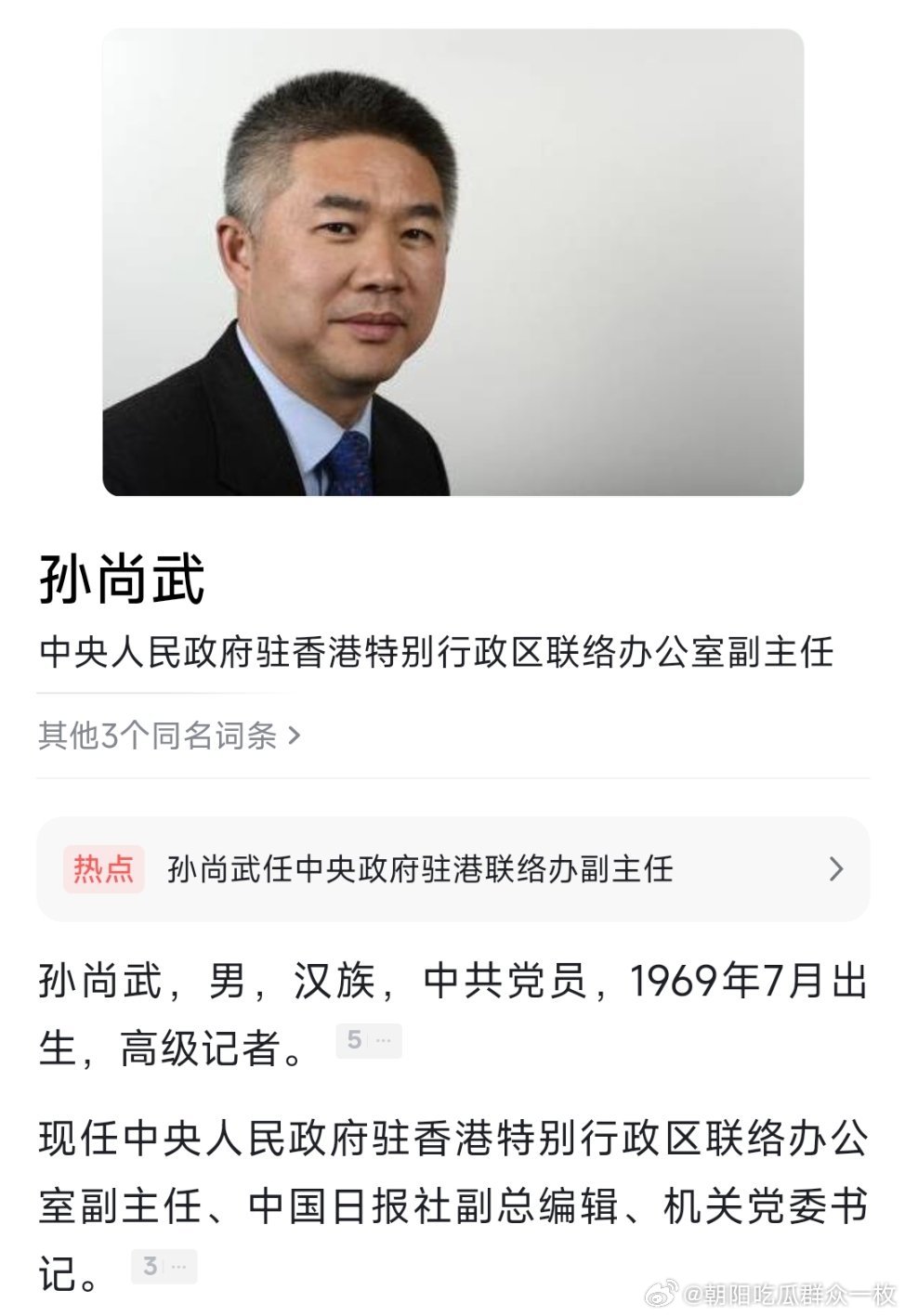 孙尚武任中央政府驻香港联络办副主任。热点现场
