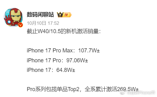 iPhone17系列激活量曝光 算了一下,iPhone17系列9月19号上市,3周的销量270W,如果Air一块上直接破300,而且还是越贵卖得越好。产品力没啥创新,卖的倒是越来越多,这找谁说理去[摊手][摊手]