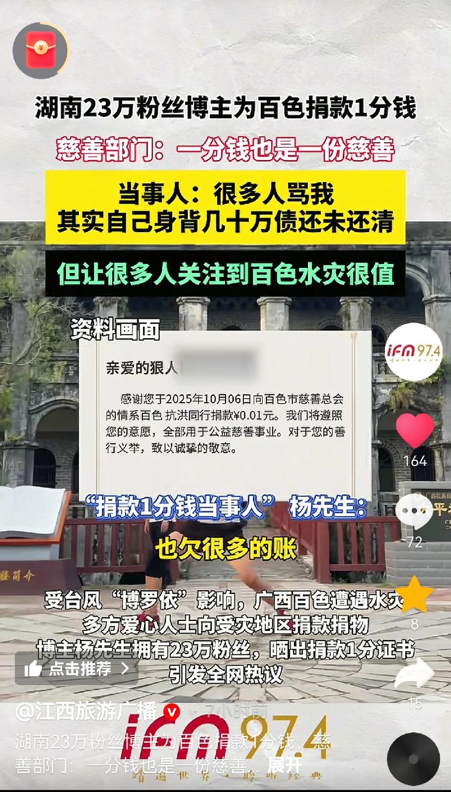 这个人真聪明 用一分钱获得了天大的流量 草船借箭都没他高明,事情是这样的 湖南一个23万粉丝博主为百色捐款一分钱,然后晒出了捐款证书。 他表示,很多人都骂他,但是他想通过这种方式让更多人了解到百色的水灾。 自己目前手头也困难,还有很多债务没有还清,所以捐一分钱。 慈善部门对此也没有什么话可说,只能说一分钱也是一份慈善。 我觉得大家都不傻,很多明眼人一看就知道是咋回事了,谁没钱还差个十块八块的。 我觉得他就是用心不正,只不过慈善部门也没法说啥,大家怎么看?