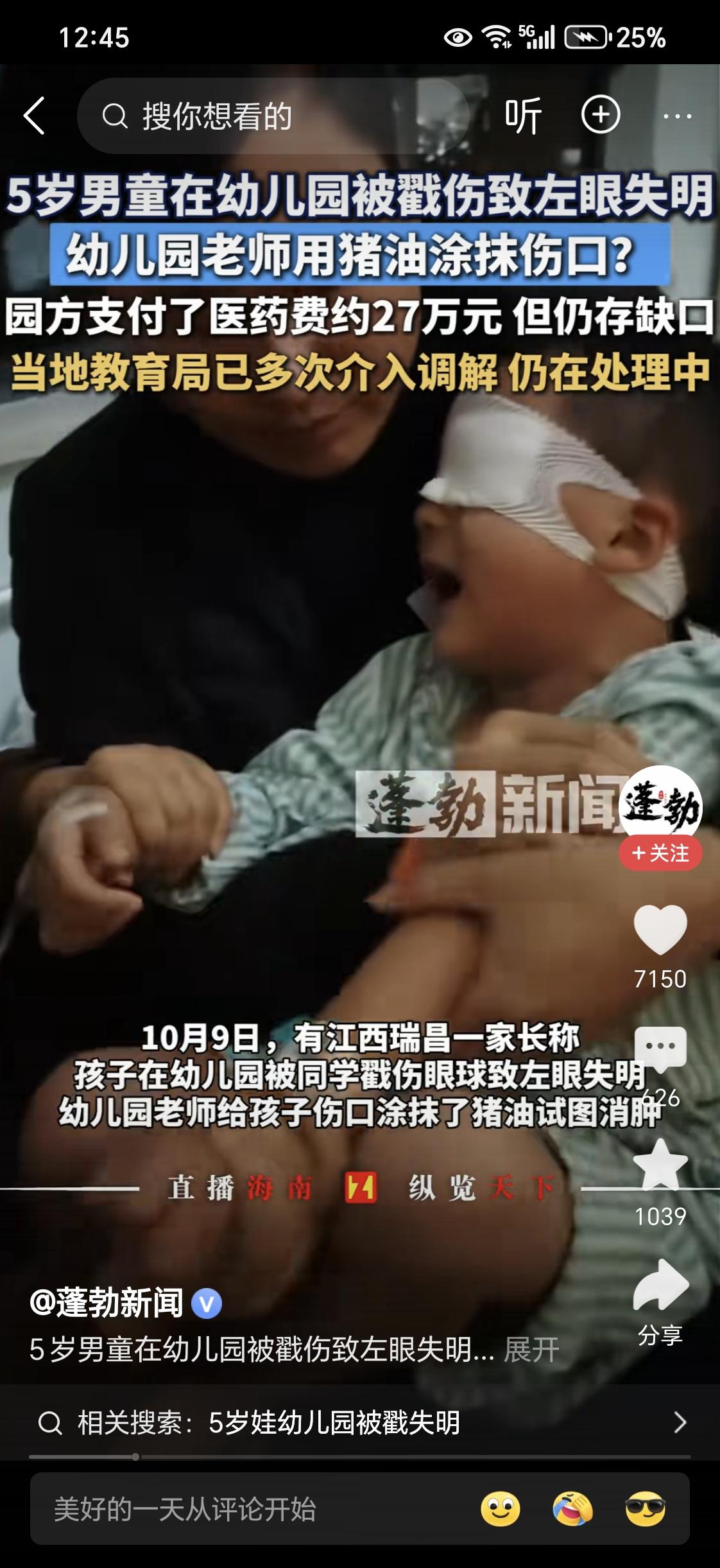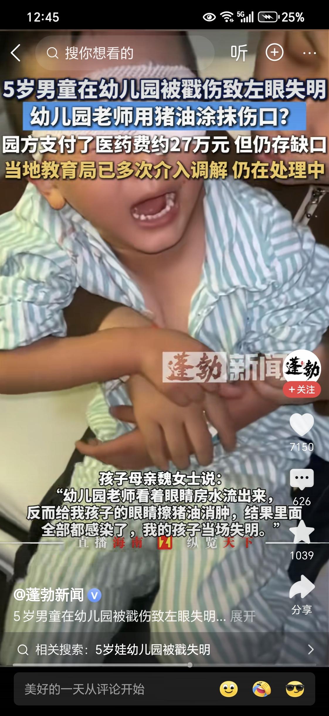 五岁男宝宝被同学用铅笔戳瞎眼。事发幼儿园。家长万分着急,学校已赔付27万,但远远不够后续的医疗费用啊! 痛心咯! 医院中小男孩一直哭闹,说眼睛睁不开了! 哎呀,看不得这样的真实新闻, 心里很紧张,一只眼睛失明了, 这小男孩以后怎么办? 眼睛是心灵的窗户。 [祈祷][祈祷][祈祷][祈祷][祈祷][祈祷][祈祷][祈祷]希望早日康复! 儿童眼部问题