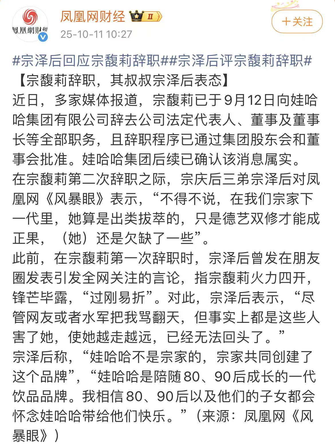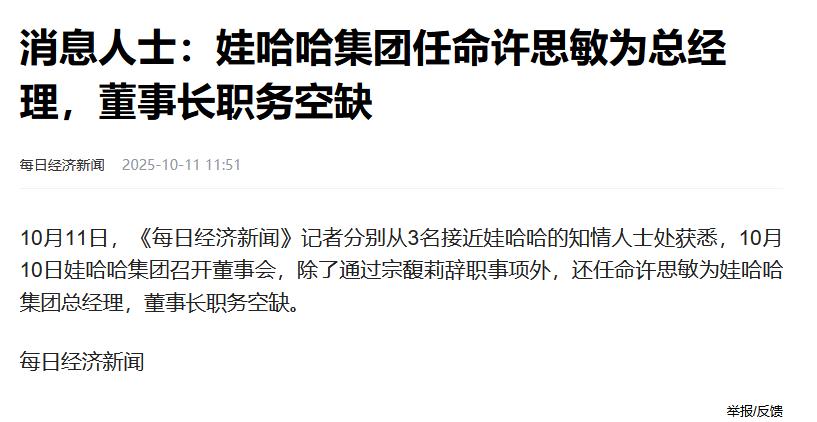 娃哈哈一纸公文:总经理帽落到许思敏头上董事长椅子仍空。行业群里刷屏“配”。