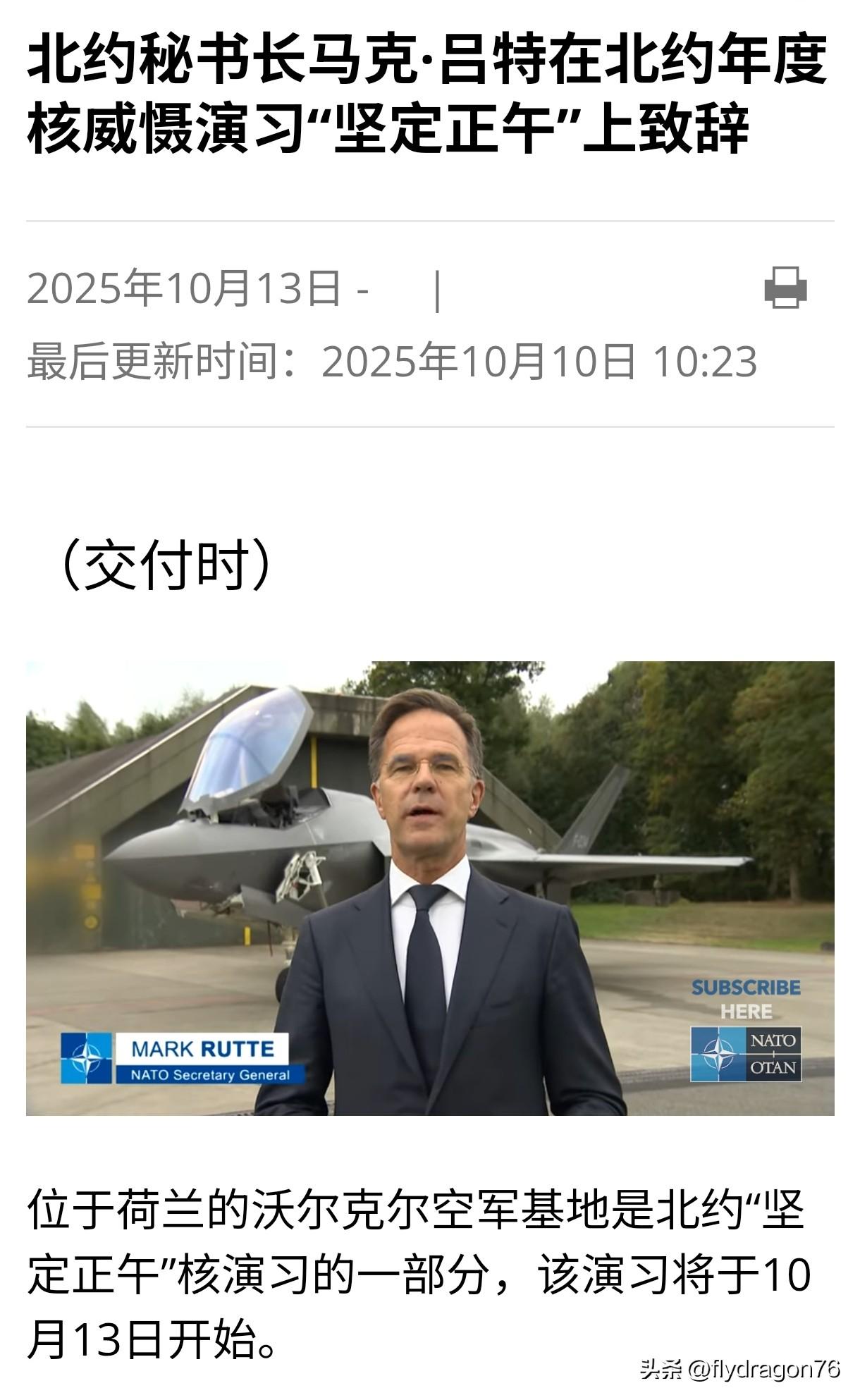 ⚔️北约开始年度核演习“坚定正午” 自10月13日起,北约开始为期两周的年度“坚定正午”(Steadfast Noon)演习,旨在检验联盟对核威慑的准备情况,并演练在可能使用核武器前保护核武库的措施。 🔷 演习活动主要在北海上空进行。主要参与国家包括🇧🇪比利时、🇬🇧英国、🇩🇰丹麦和🇳🇱荷兰。 演习由荷兰领导,参与的有来自北约14个国家的71架飞行器,包括能够携带核武器的轰炸机和战斗机。但据称,实际的核弹头和弹药不会被使用。 重点关注地面核武器的保护。 🔻演习中使用的装备包括: 🇺🇸✈️ 美国空军的F-35,具备核打击和常规打击能力, 🇫🇮🇵🇱✈️ 加油机和辅助飞机, 芬兰和波兰空军的战斗机, 🔵 电子战、侦察和目标指示设备。