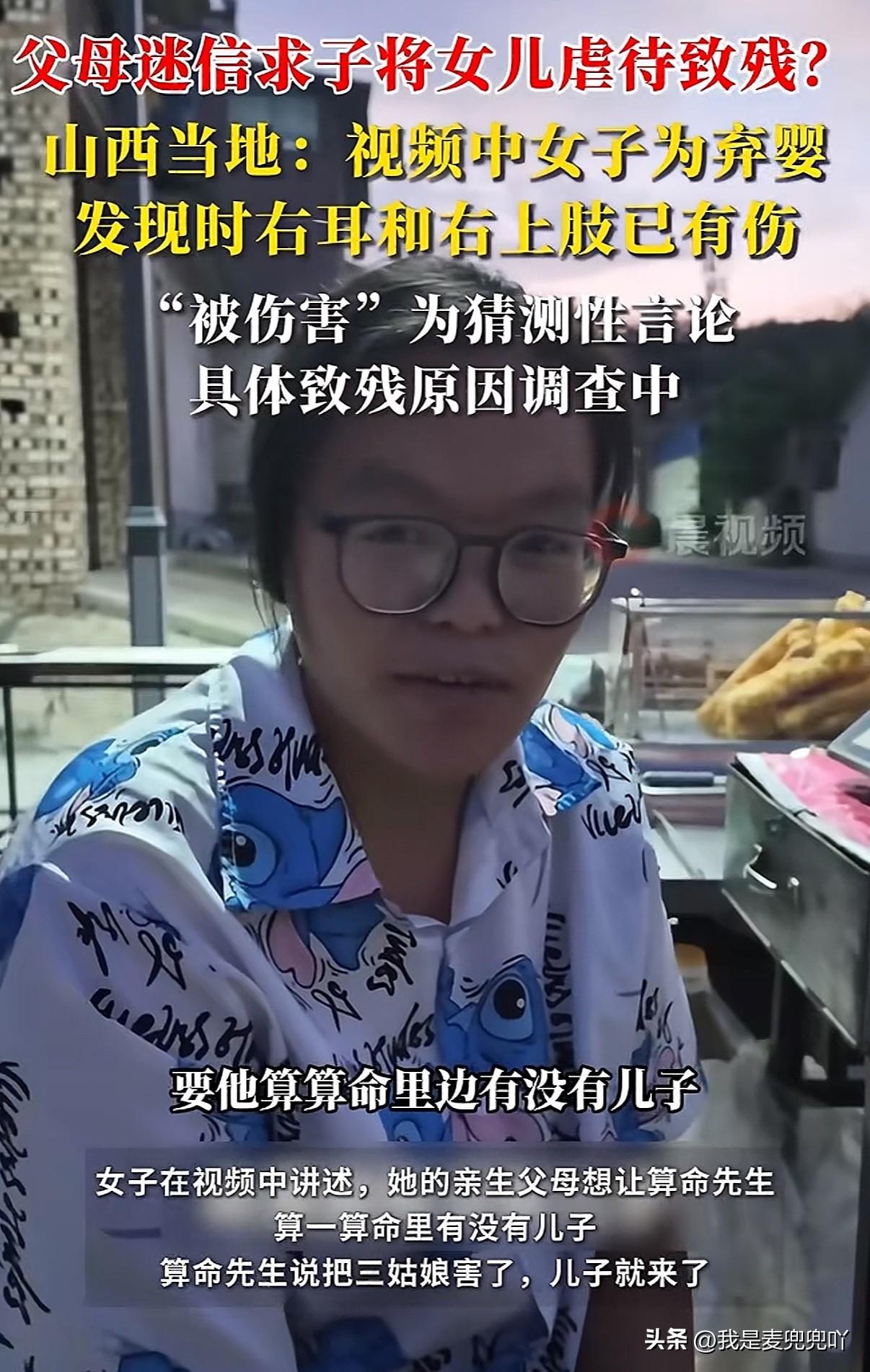 女婴被父母割掉耳朵砍去手臂后遗弃只因算命先生说只有这样做才能生儿子 近日山西一网友发视频称在长治街头有一对残疾夫妻靠卖油条和一些小吃生活,当问到女子残疾是怎么造成时女子称自己的耳朵和手是被亲生父母砍掉的,手和耳朵都被砍掉后装在纸箱内丢弃在省道边在02年10月被养父捡到,养父送到医院治疗后便抱回家将其抚养长大 该视频一经发出引网友震惊也引起当地相关部门关注,工作人员表示已经介入调查,女子为弃婴属实,夫妻二人确实均有残疾在松村镇经营一个小吃摊靠卖油条等一些小吃维持生计,但女子所说残疾是由亲生父母因听算命先生所言故意伤害造成的暂时没有事实依据可以证明,只是当时为她治疗的医生都是这样猜测的并告诉了她的养父,警方表示具体导致她受伤的原因目前还在调查中,有结果会及时通报 信源:极目新闻