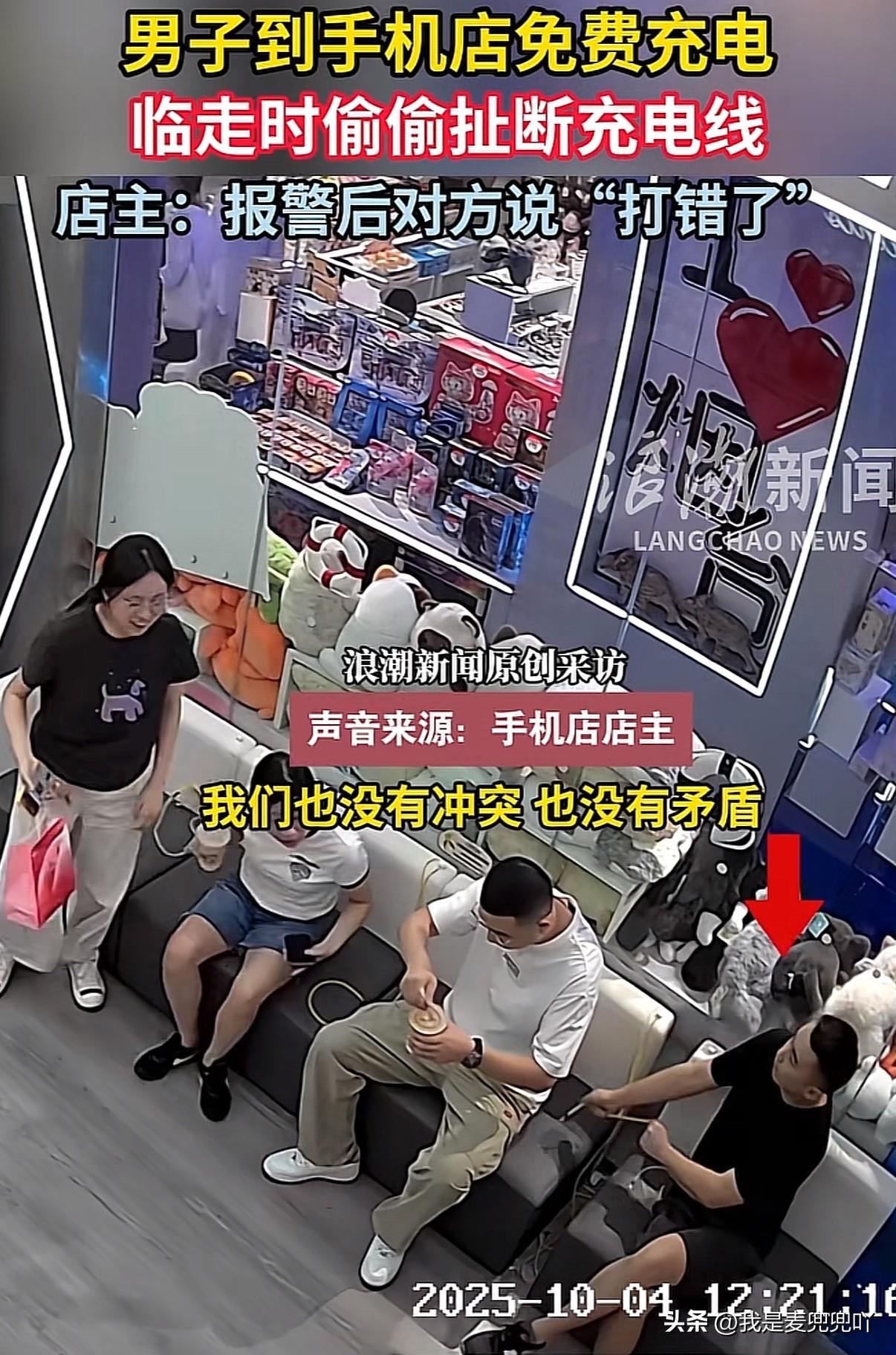 总有人坏的莫名其妙 山东烟台一店主在店内提供休息区供游客休息并提供充电线免费给手机充电,10月4号两男两女一行四人进店坐在店内沙发上一边给手机充电一边有说有笑的待了半个多小时,店主表示期间没有和这四人发生任何争执或冲突搞不懂黑衣男子为什么会这样做 一行四人充完电临走的时候黑衣男子将两条充电线全部扯断,同伴无一人制止。由于老板当时在忙别的事并没有看见黑衣男子的行为。事后发现充电线被人扯断调取监控被气的不轻,目前店主已经报警并表示充电线不值钱但这种行为太恶劣太让人生气,希望能得到黑衣男子的一个道歉 警方表示由于涉案金额太小只能按行政案件立案处理,警方表示黑衣男子为哈尔滨人事发后已经驾车离开烟台。在警方帮助下与男子取得电话联系在说明事情后男子只回了一句“你打错了!”后便再也不接电话 这不是损坏多少钱的问题这人是坏,天生的坏心眼。店主没让你花钱租充电宝免费提供场地给你休息还可以给手机充电得不到一句感谢的话就算了临走还要搞破坏,这不是典型的吃饱饭就掀桌吗? 店主表示不要求男子赔偿只要求他道歉 信源:浪潮新闻 百姓关注