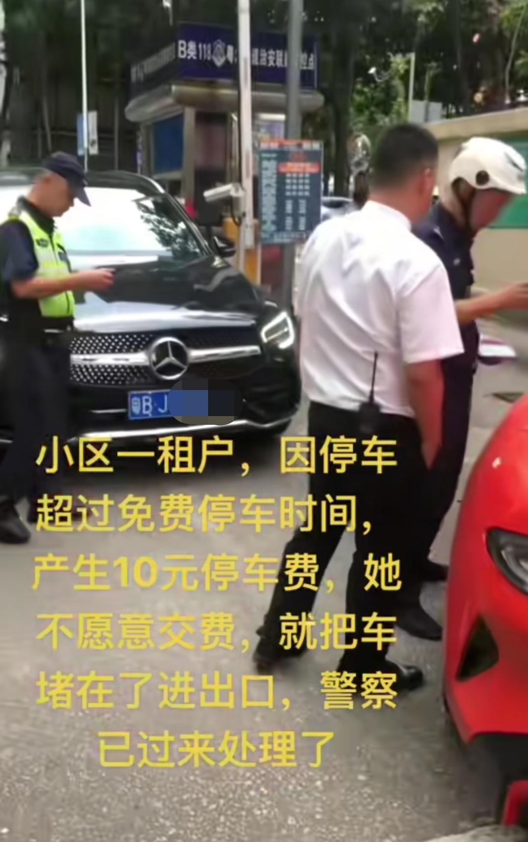 10月10日,广东。小区里女租户因停车超出免费时长,产生10元停车费却不愿缴纳,