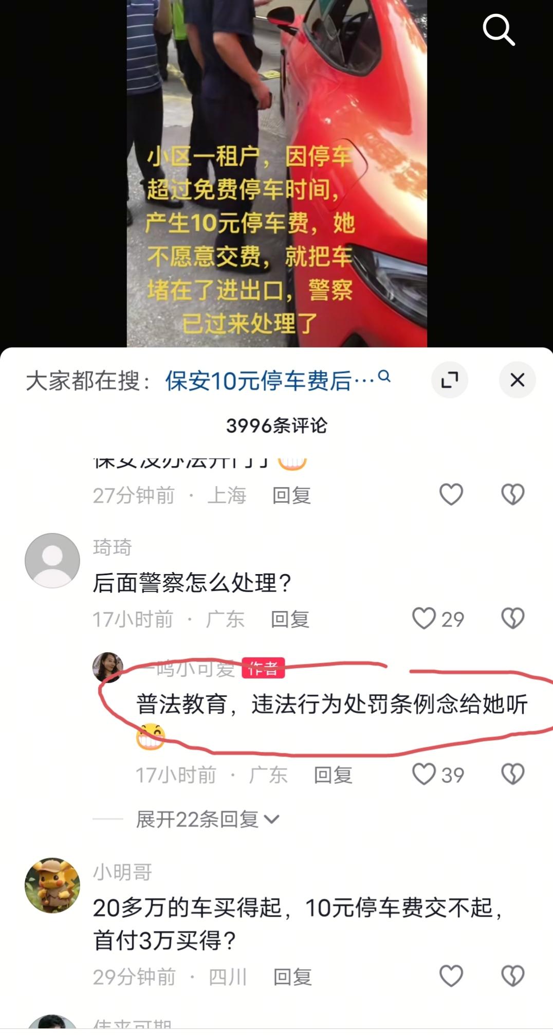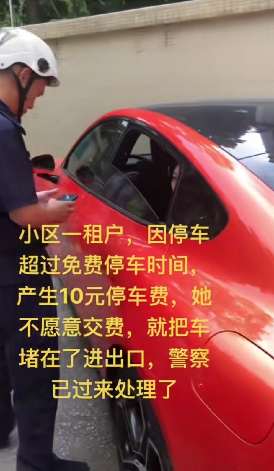 10月10日,广东。小区里女租户因停车超出免费时长,产生10元停车费却不愿缴纳,于是将一辆红色汽车堵在小区进出口…… 视频发布者称:jc来到现场后,对她进行了普法教育,违法行为处罚条例念给她听。现在进出都正常了。 有网友吐槽:能买的起二三十万的小米酥妻,交不起十块钱停车费,我也是服了。美女小姐姐、小米车主、租户,真的完美的组合! 各位网友,你们怎么看?