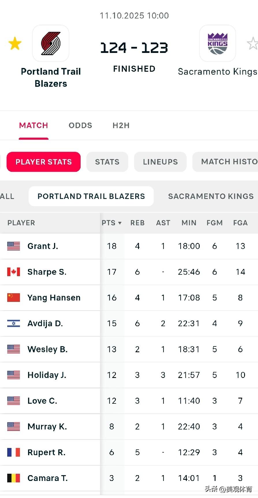 杨瀚森NBA第二场比赛技术统计 在波特兰开拓者与国王队的季前赛比赛中,开拓者以