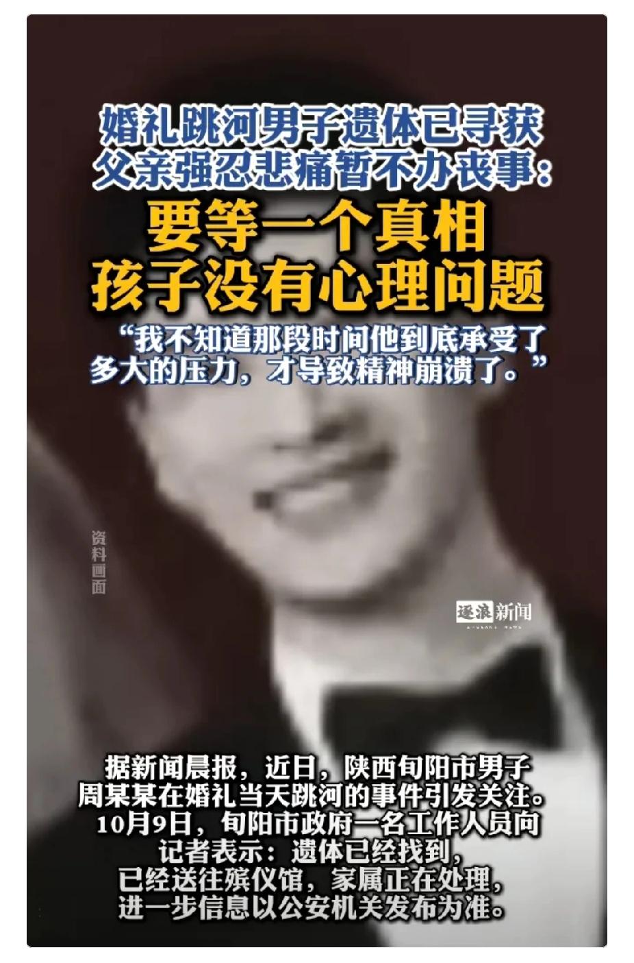 旬阳的新娘这回估计难辞其咎了!新郎家属表示先不办葬礼,要查明真相,还给儿子一个公道。 新郎的父亲说:“我儿子没有心理问题,怎么会突然想不开,我们想知道他承受了什么样的压力。” 想弄清楚事情的经过,可以调取新郎的手机聊天记录、行车记录仪等等,或许能找到证据。 很多网友觉得新娘也不能全逃脱干系。 对此,你们怎么看呢?