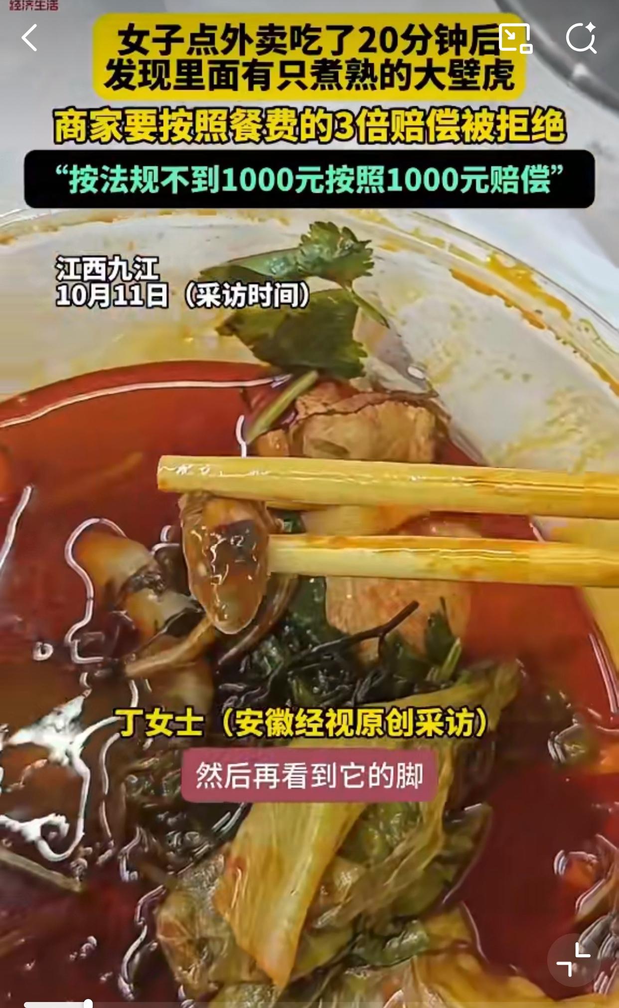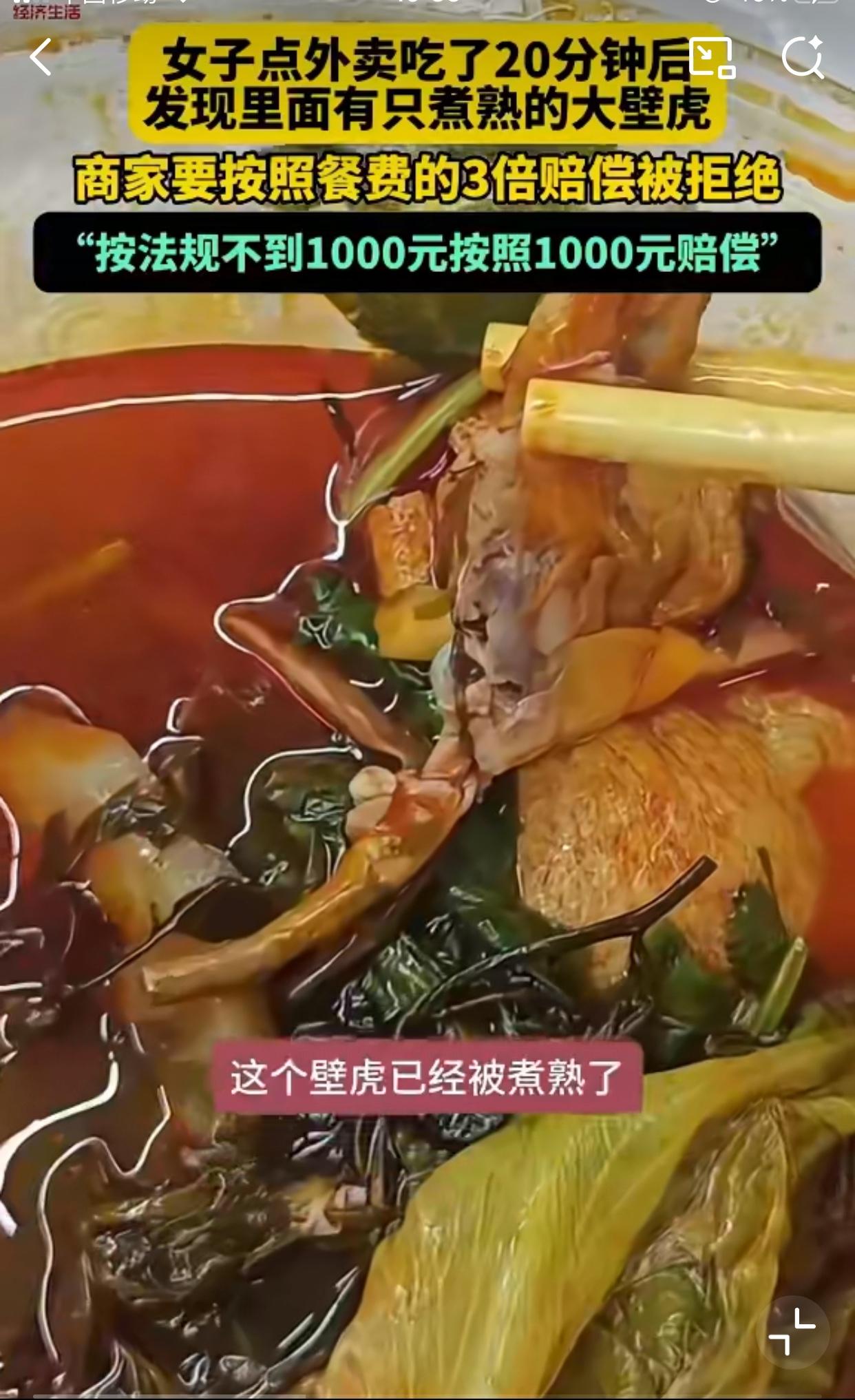 好消息:没有毒! 坏消息:我想吐! 近日江西九江的丁女士点了一份麻辣烫外卖,可在丁女士吃到一半时,发现了“惊喜”,一只煮熟的大壁虎沉睡在里面,丁女士瞬间恶心坏了🤮 于是联系了商家,由于后厨没监控,也不知道壁虎从哪来,商家说可能是从天花板上掉落进去的,商家愿意进行三倍赔偿(原价20),丁女士不同意,丁女士说:根据食品安全法148条,不符合食品安全标准的的食品,3倍赔偿,不足1000的按1000赔偿!但商家不愿意,让丁女士走法律程序! 截止目前还在调查当中,最终判定要等卫生核查结果! 吃外卖吃到意外的加餐,真的是太恶心了,这怕是都会吃出阴影来了!如果是你,你会接受商家的三倍赔偿吗?