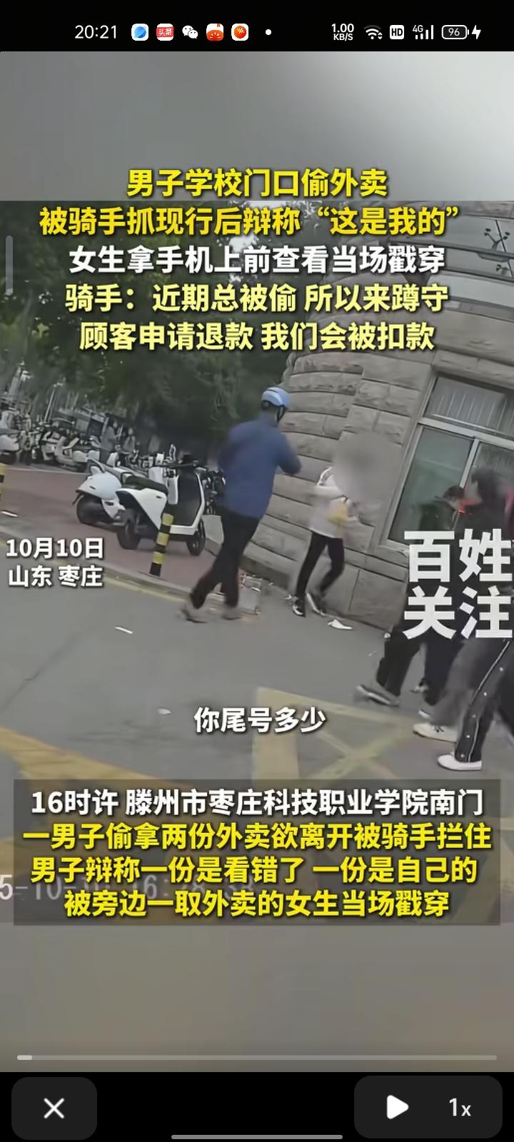 10月10日,枣庄滕州市。一男子偷拿两份外卖欲离开被骑手拦住,男子辩称一份是看错了,一份是自己的,被旁边取外卖的女生当场戳穿。骑手张先生称,因学校门口总有外卖被偷,当天最后几单正好是学校,便在旁蹲守。餐丢了以后可以申请退款,钱扣到骑手身上,骑手被扣钱要难受好几天。本来一单都挣不了几个钱,当时去学校打电话是女生接的,出来一看是男生。 这种偷拿外卖还狡辩的行为确实既不道德又自私,尤其对骑手来说,更是雪上加霜。而学生订外卖没能等到外卖送到门卫室,更是气人。或许可以通过加强周边监控、规范外卖存放区域等方式,从环境上减少这类情况,让骑手的辛苦不被辜负,也让大家的订餐能更安心。