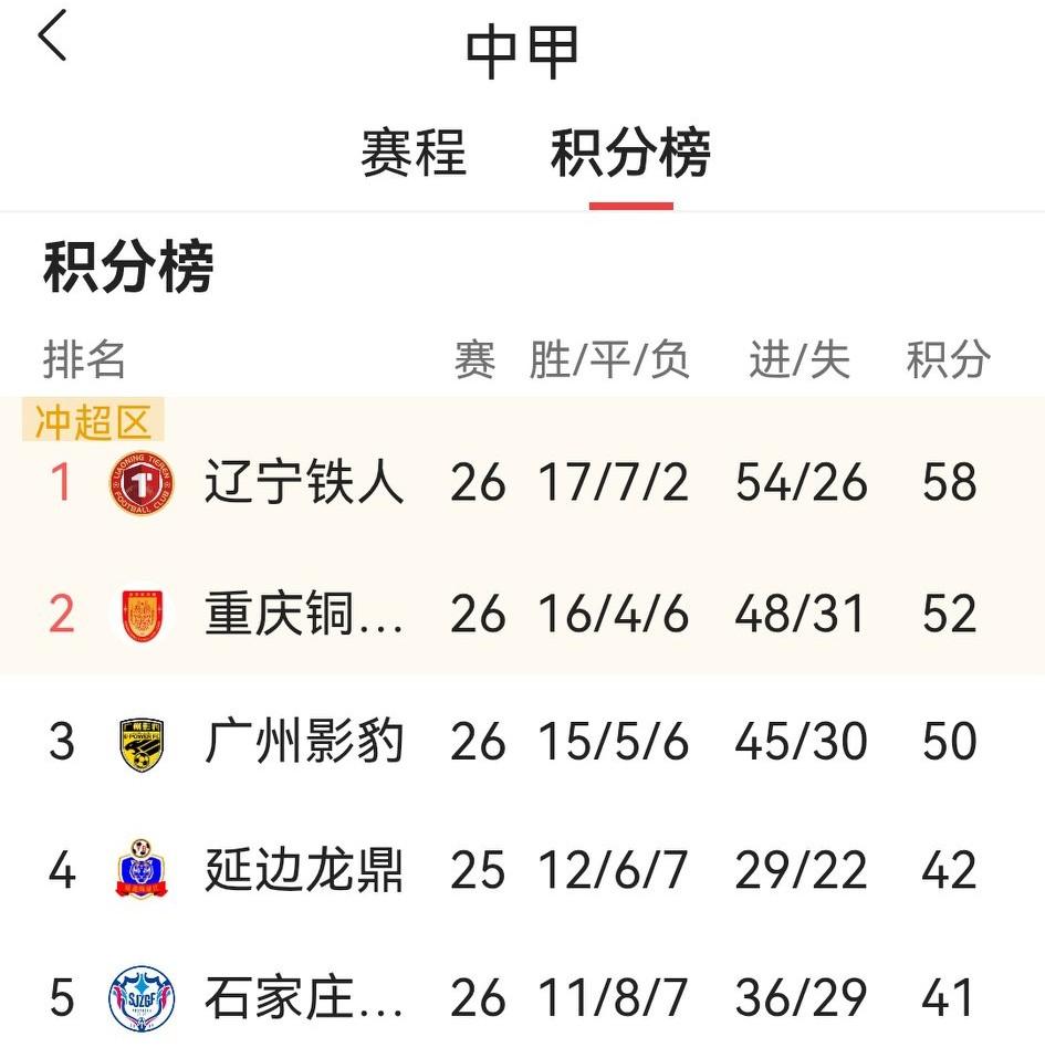 不看不知道,世界真奇妙。中甲打到最后4轮,BIG3突然一起睡醒了。 今晚先赛几场,辽宁铁人客场2:1废了功夫,以剩3轮领先8分的巨大优势,1只脚伸进了中超;第二名重庆铜梁龙主场挑落佛山南狮,继续瞄准中超,关键是主力射手向余望又又进球了;第三名广州影豹,更是主场4:1大胜南京城市,仅以2分之差对老二不依不饶…… 回看本赛季,重庆一度遥遥领先却突然连踩刹车,除辽宁顺利反超外,排在后面的队伍都只是尾随,让大多数球迷都懵逼了。如今又开始拼命冲超,中甲江湖大戏又掀高潮,重庆和广州冲超悬念,很可能最后一轮才见分晓。