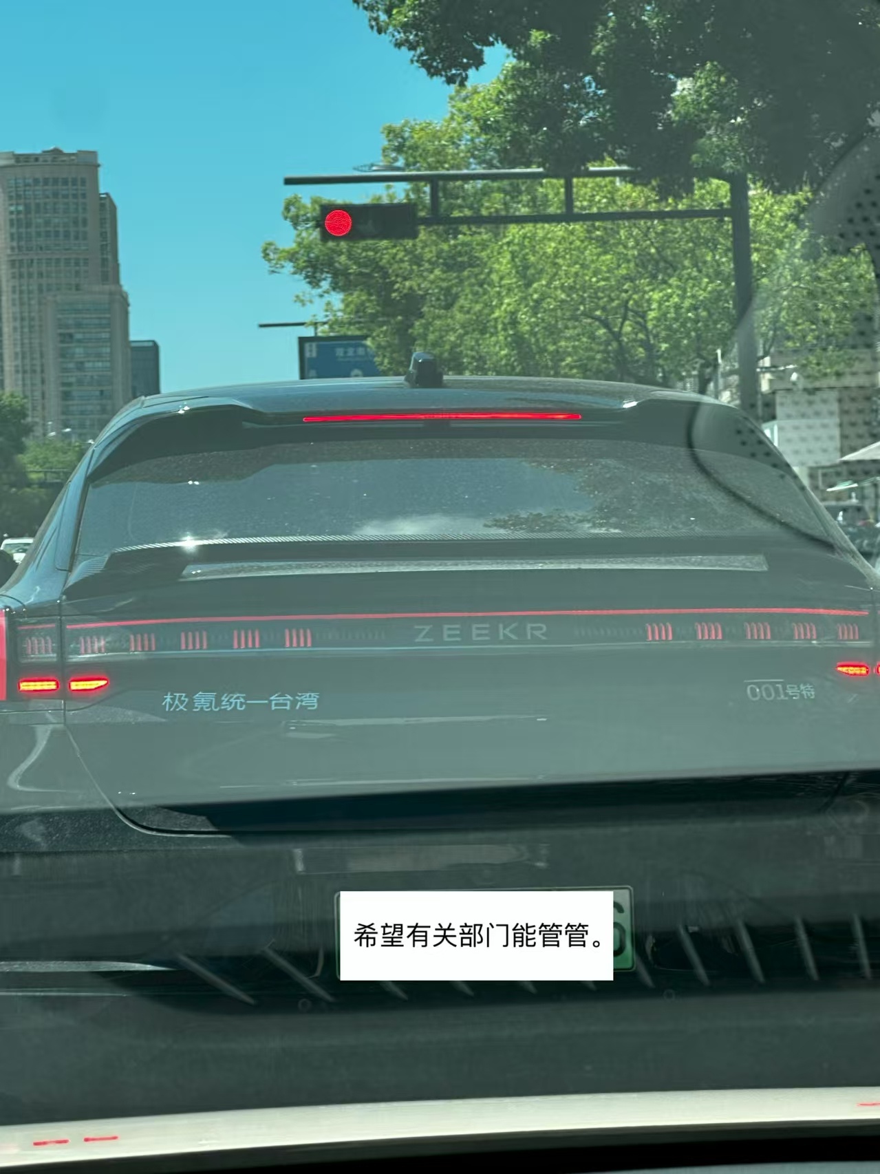 看到一辆极氪 001 车子后面贴的这个标语,我希望有关部门能管管!