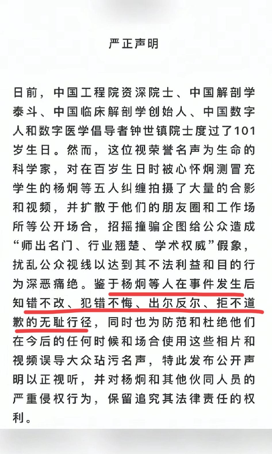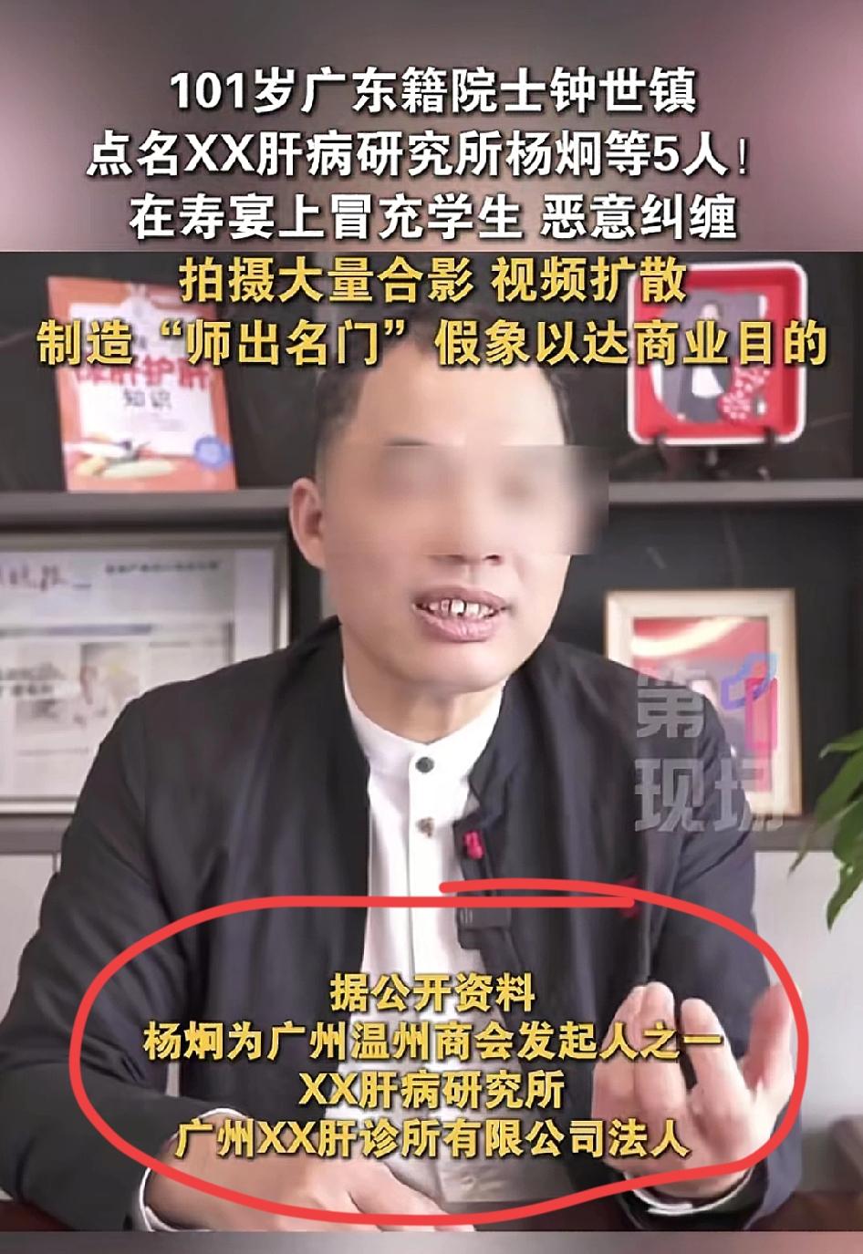 真是精明的过头了,竟然跑泰斗级人物生日宴刷存在感、蹭名气去了!搅得钟老101岁生日都没过好。 这个叫杨炯的商人是温州商会发起人之一,开着某肝病研究的公司。如果跟钟老套上关系,那肯定对他生意是有大大好处的。 套不上关系就硬套,也是没谁了! 平时不好见面,就假冒学生闯进寿宴,一顿拍拍拍。 未得到本人同意拍照或利用合照得利已经侵犯了别人的权益,被追诉一点儿都不冤。 更可气是知错不改、拒不道歉,这下人家发声明了,前功尽弃不说,倒是真“出名”了!可惜不是啥好事的“名”。 净给老人家添堵,101岁!多难得多有纪念意义的日子啊! 明年过寿宴时可得严把门了,小心再被别有用心之人利用。