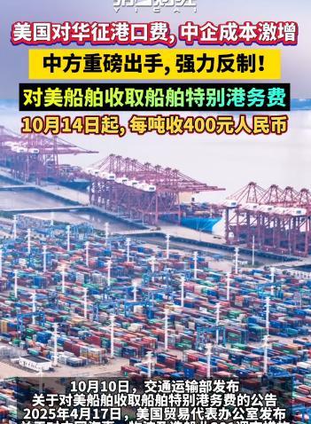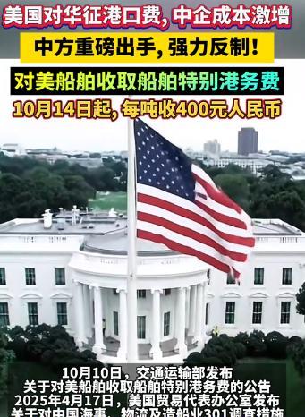 中国突然亮剑!美国船进港每吨收400元! 中国交通运输部宣布,自10月14日起,所有进入中国港口的美国船舶需缴纳高额的“特别港务费”。 10月10日国庆假期刚结束,交通运输部官网弹出的一则公告让全球航运圈瞬间安静。 自10月14日起,对美国实体拥有、运营或挂美国旗的船舶,按每净吨400元征收特别港务费,2028年将升至1120元/净吨。 这场博弈的火药桶,其实早在半年前就已埋下。 4月17日,美国贸易代表办公室抛出301调查终裁,宣称要“振兴本土造船业”,宣布10月14日起对中国籍、中企运营或中国制造的船舶加收港口费。 具体标准藏着明显的歧视:中国船东的船收50美元/净吨。 中国造的船按18美元/净吨或120美元/集装箱“就高收费”,汽车运输船还要再加14美元/净吨。 按中信期货的算法,一艘10000TEU的中资货轮,单航次费用能从280美元/TEU飙到785美元/TEU,相当于多交近500万美元。 美国嘴上喊着“公平竞争”,实际却是打肿脸充胖子。 波罗的海国际航运公会测算,全球35%的船队都可能被波及,其中散货船受影响比例高达45%。可自家造船业早就撑不起场面。 全球订单占比仅0.7%,连港口起重机都要靠中国振华重工供货,反观中国占了全球71%的造船份额,这样的差距根本不是收费能扭转的。 更讽刺的是,美国连收费流程都没理顺,直到10月初才明确要通过财政部平台缴费,逾期就不让装卸货,急得本土港口运营商私下抱怨“这是把船公司往别处赶”。 面对这手单边主义牌,中国没有立刻接招,而是用178天布了一局稳棋。 9月底先修订《国际海运条例》,明确“对歧视性措施可对等反制”,给收费政策扎牢法律根基。 同时把美国告上WTO,走通多边程序;还挨个调研港口、船东和货主,算清了每一分反制成本。 10月10日亮出的方案,精准得像手术刀:收费和美方同一天生效,覆盖所有涉美船舶堵死“换旗绕道”的漏洞。 阶梯涨价踩着美国财年和2028大选的节点,让美企和政客同步承压;更留了人情味。 同一艘船一年最多收5次费,挂靠多港只在首港交钱,避免国内企业被连带影响。 美国想靠收费卡别人脖子,反倒先卡了自己的脚脖子。 洛杉矶港7月还因企业抢运创下117年来单月吞吐量纪录。 但随着航运公司纷纷调整航线,美国全国零售商联合会预测,2025年美国主要集装箱港口进口货运量将比2024年下降5.6%。 中西部的农场主已经慌了,大豆出口靠海运,额外费用让每吨成本涨了15美元,这些成本最终会转嫁到美国消费者身上。 盟友们更不满,日本本田、日产每年要从中国进口大量汽车零部件,德国西门子的设备供应链也离不开中国,达飞轮船高管就公开表示“贸易战没有赢家,只有输家”。 这场较量里,中国的400元收费只是表面动作,真正的底气藏在战略纵深里。 9月底稀土出口管控新规刚落地,把导弹、航空发动机急需的稀土材料列入管制,这等于掐住了美国军工的“命门”。 再加上全球71%的造船份额和十大港口占七席的优势,中国手里的牌远不止港口收费。 更妙的是法理和舆论的主动,1988年《中美海运协定》写的“非歧视原则”还在。 美国撕毁规则在先,中国反制自然师出有名,连法国港口协会都公开说“早受够美国的单边主义了”。 10月14日越来越近,上海港的缴费窗口已经准备就绪。 400元/净吨的收费标准,既不是要彻底撕破脸,也不是单纯的报复。 就像公告里留的活口:“具体实施办法另行制定”,潜台词很明确,只要美方回到规则轨道,费用可以减、可以停。 这场没有硝烟的博弈,本质是规则话语权的争夺。 美国想靠行政手段扭曲市场,中国就用透明合规的反制守住底线;美国想破坏全球供应链,中国就用留有余地的措施维护稳定。 从WTO诉讼到稀土管控,从港口收费到企业有序调整,每一步都在传递一个信号。 中国不愿斗,但也不怕斗,更想通过这场博弈,推动建立更公平的全球航运秩序。 当第一艘美籍货轮在10月14日停靠中国港口,扫码缴纳400元/净吨的费用时,全世界会看清:霸权换不来利益,规则才是通行证。 中国的“全局布局”从来不是赢下一场收费战,而是在全球治理中,为公平正义争取更多话语权。 信息来源:第一财经2025-10-09发布:美国对华船舶加征港口费:船企成本激增,中国如何反制 中华人民共和国交通运输部2025-10-10发布:交通运输部关于对美船舶收取船舶特别港务费的公告 封面新闻2025年10月10日发布:如何对美船舶收取“特别港务费”?交通运输部发布公告