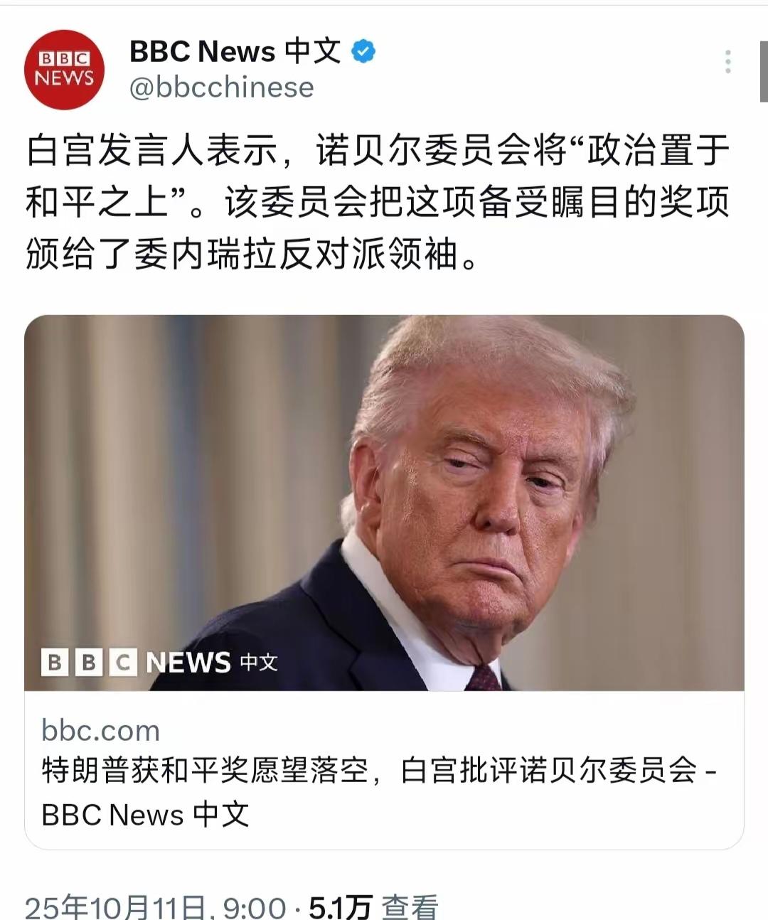英媒:特朗普获和平奖愿望落空,白宫批评诺贝尔委员会 据英国BBC中文网10月11日报道:“白宫发言人表示,诺贝尔委员会将“政治置于和平之上”,这委员会把这项备受瞩目的奖项颁给了委内瑞拉反对派领袖”。 美国白宫发言人这次难得说了个大实话,诺贝尔委员会将“政治置于和平之上”,亲自揭露了诺贝尔和平奖一直以来都是美西方国家“政治工具”的本质。 其实,美国本是西方国家阵营的“带头大哥”,白宫发言人并非良心发现才对诺贝尔委员会自揭“伤疤”,而是为了安慰自家“老板”(特朗普)日思夜想获得诺贝尔和平奖现“丢失了”的失落情绪,为自己“老板”喊冤! 然而,最令人尴尬莫过于美国现国务卿鲁比奥,因为现在获得诺贝尔和平奖的委内瑞拉反对领袖就是鲁比奥还是国会议员时、帮助其获诺贝尔和平奖竞选申请参与共同提名之一。鲁比奥怎么也不会想到,当时帮委内瑞拉反对领袖提名是为了现“老板”(特朗普)挖坑呢?抢了自家“老板”的风头,让自己“老板”失落难过,你说鲁比奥能不尴尬吗?