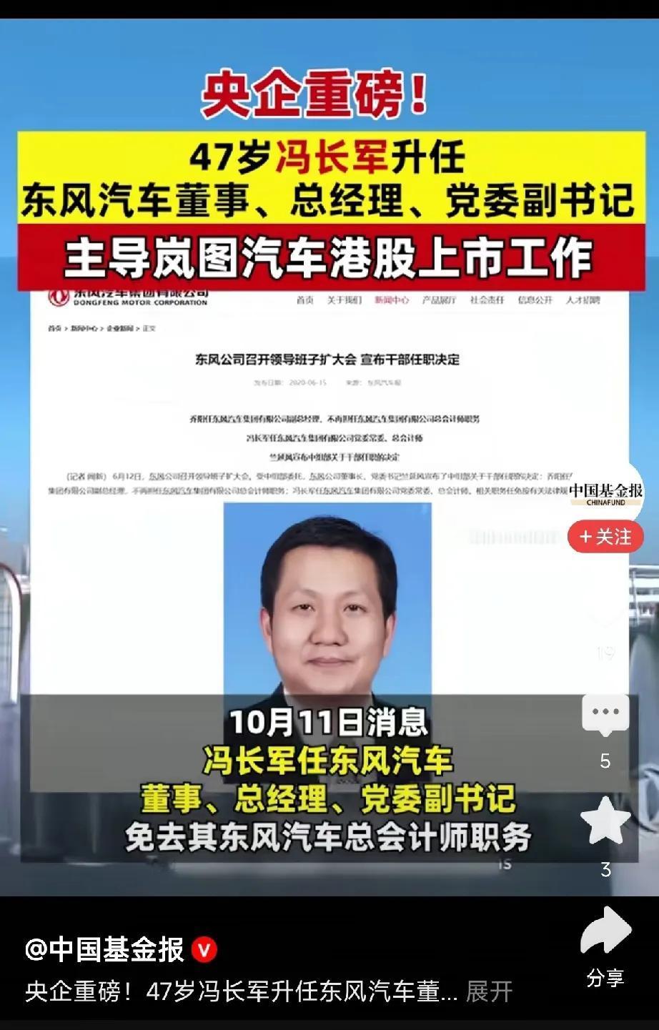 东风二把手冯长军正式上任,是了更好的主导岚图港股上市的工作? 目前东风汽车正在调