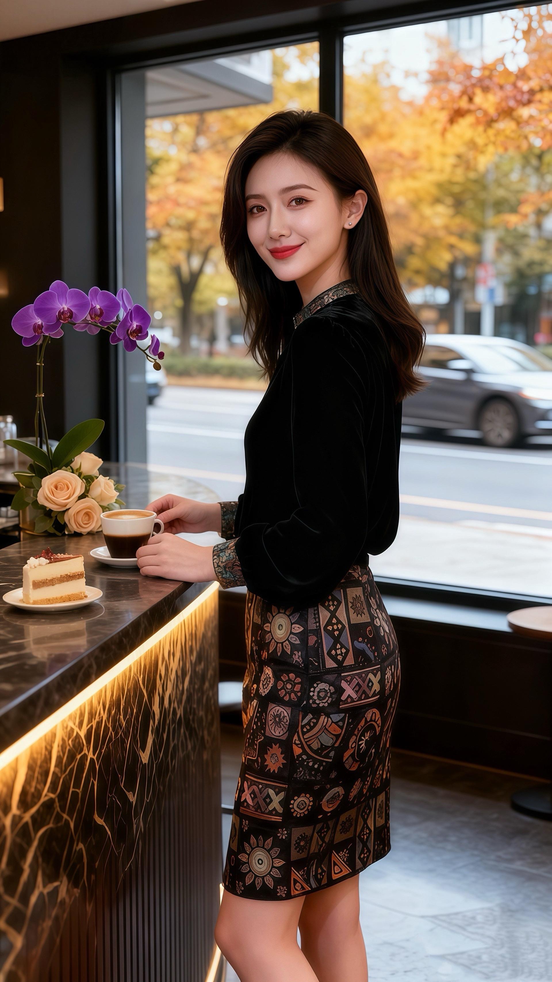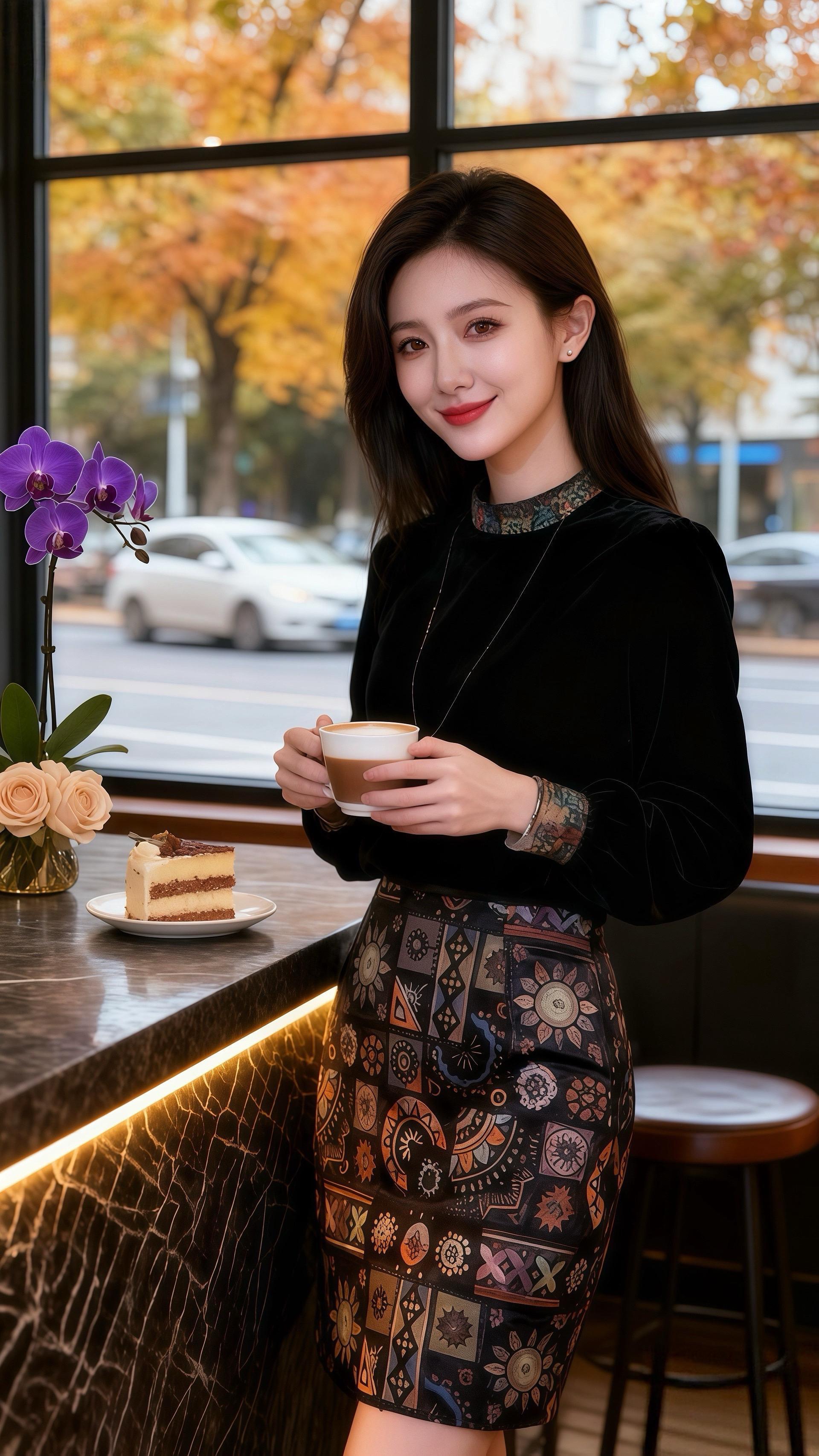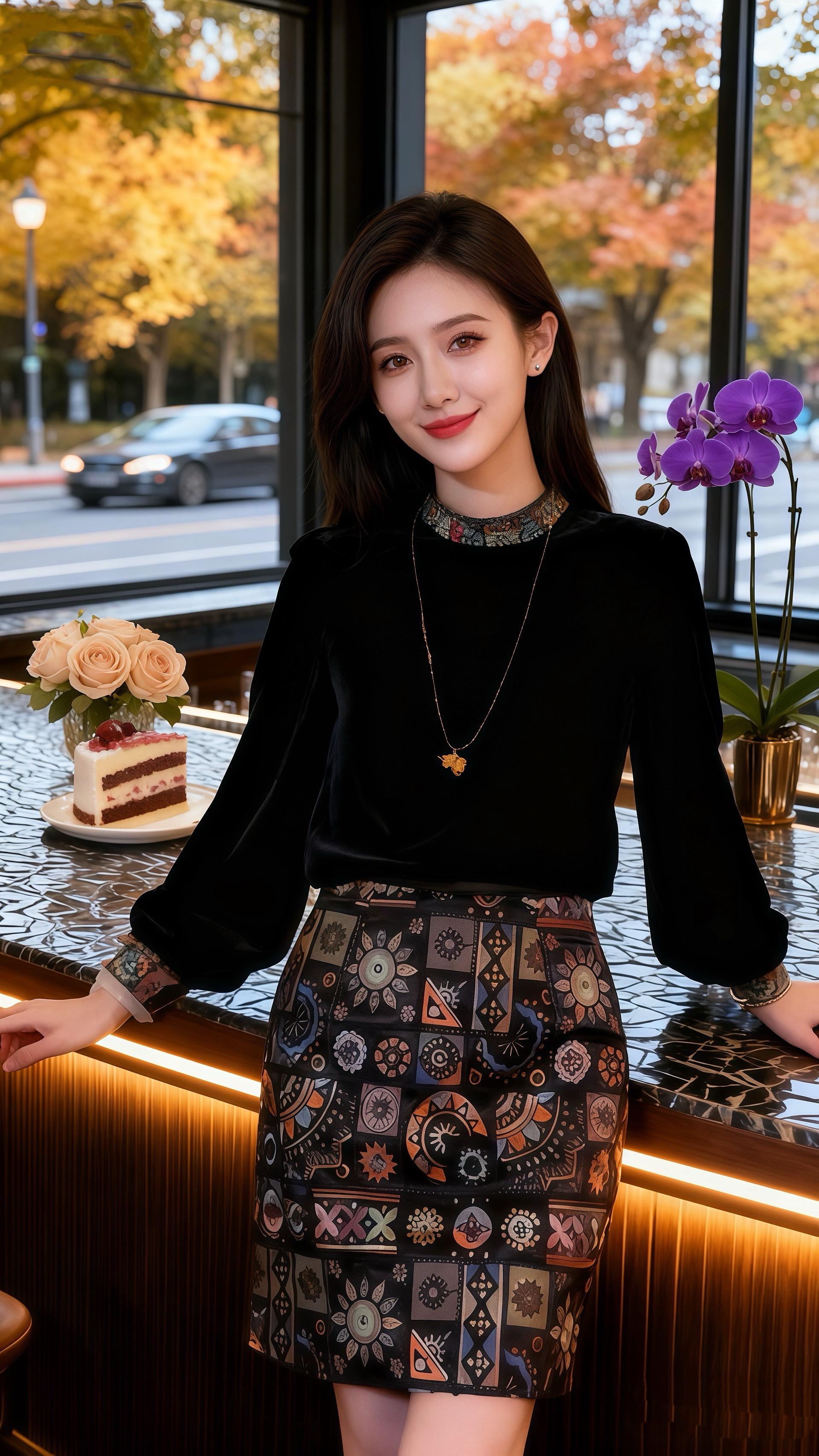 秋日的咖啡馆里,暖光映着许妍的身影。她身着黑色丝绒上衣,领口和袖口的花纹精致细腻,搭配一条满是艺术感图案的半身裙,优雅又别致。