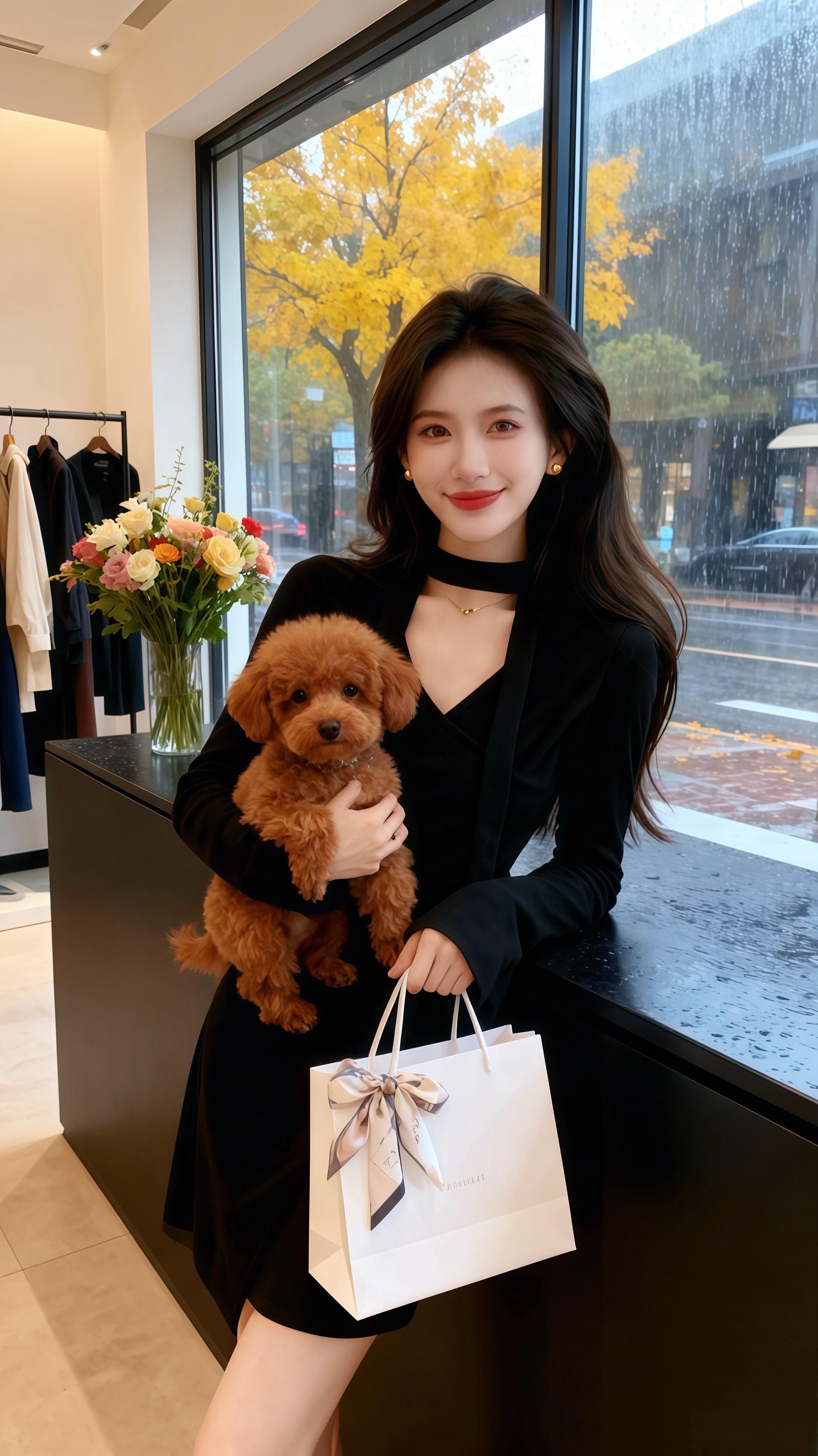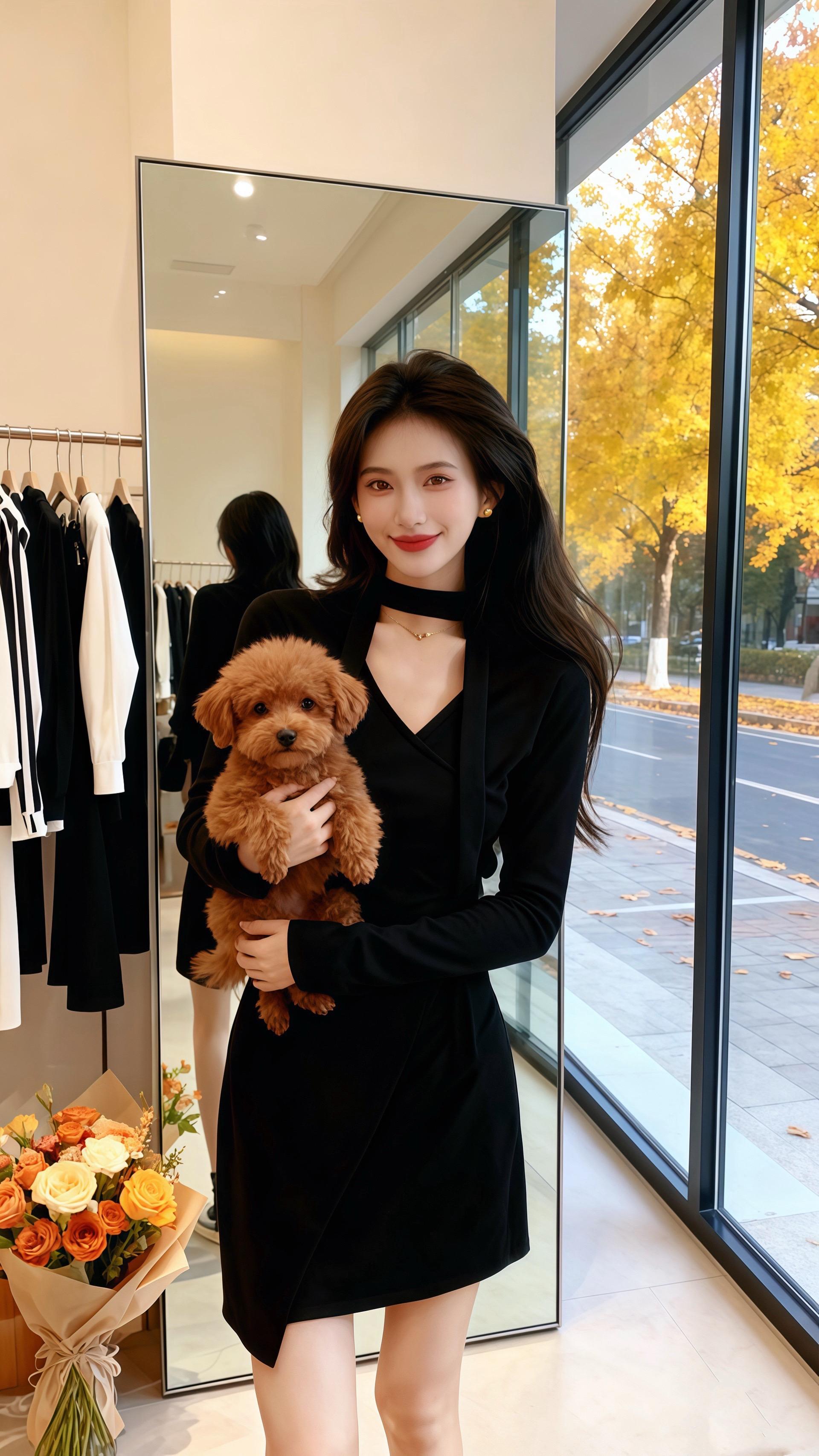 深秋的女装店里,暖光落在许妍身上。她身着一袭黑色连衣裙,领口的设计别致又优雅,裙摆的剪裁衬得她身姿窈窕。皓明推门进来,目光瞬间被她吸引。