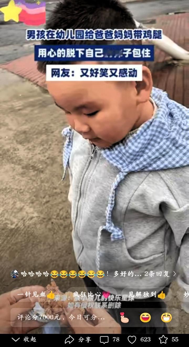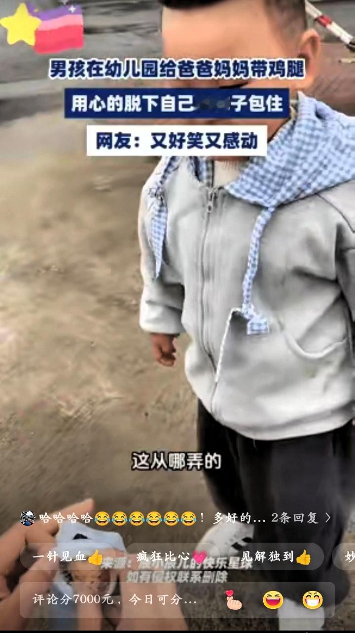 太感动了!”,夫妻俩去接三岁儿子幼儿园放学,三岁的儿子就背着小书包冲过来,没等爸妈开口,“哐当”一声就把书包扔在地上,蹲在那儿手忙脚乱地掏东西。 妈妈当时心里一紧,还以为孩子在园里受了委屈,是不是玩具丢了,或是被老师说哭了,连书包都顾不上好好放。 爸爸赶紧蹲下来想帮忙,结果就见儿子从书包里摸出一只袜子,攥得紧紧的。“你咋把袜子揣书包里了?脚不冷吗?”爸爸一边说着,一边伸手想拉儿子的裤腿查看,可袜子一打开,俩人都愣了——里面居然裹着个油乎乎的鸡腿,还带着点温热的香气! “幼儿园的鸡腿超好吃!”儿子仰着小脸,声音脆生生的,小手上还沾着点油星子,“我没舍得咬一口,想着妈妈爱吃,要带回家跟爸爸妈妈一起分!”说着就把鸡腿往妈妈手里塞,眼睛亮得像落了星星。 爸爸接过鸡腿时,手都有点软,哪还在意袜子皱不皱、鸡腿油不油,咬下一口,明明是很普通的味道,却比任何大餐都香。妈妈凑过来,一家三口你一口我一口,把小小的鸡腿分着吃完,连骨头都舍不得扔。旁边的家长笑着打趣,可谁都看出来,那笑声里满是羡慕。 其实养娃哪需要什么“成就感”来衡量?不用他考满分,不用他多拔尖,只要他心里装着你,愿意把最宝贝的东西攒着留给你,哪怕用袜子裹着鸡腿这种“傻办法”,就足以抵消所有深夜哄睡、早起做早餐的疲惫。 你家娃有没有过这样的瞬间?是把幼儿园的小糖果藏在口袋里带回家,还是画了张歪扭的画非要塞给你?