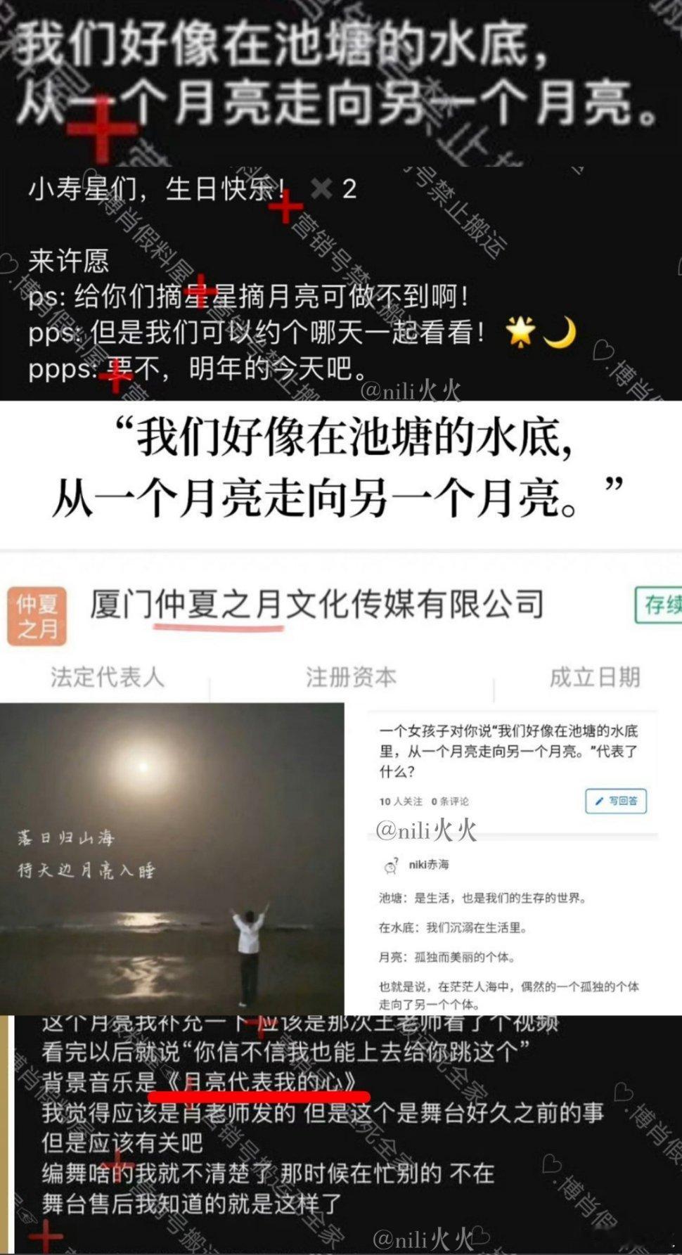 假料拍月亮出来三周年时,他俩前后脚发博时间相差21分(“爱你”)很有仪式感地都发了月亮,一起看着月亮思念着,“千里共婵娟”。赞赞舞台唱过《月亮代表我的心》。这次王啵照样拍了圆月,只是没发给我们罢了[偷笑]