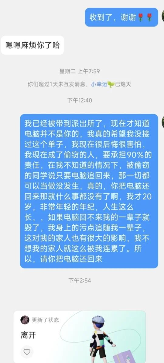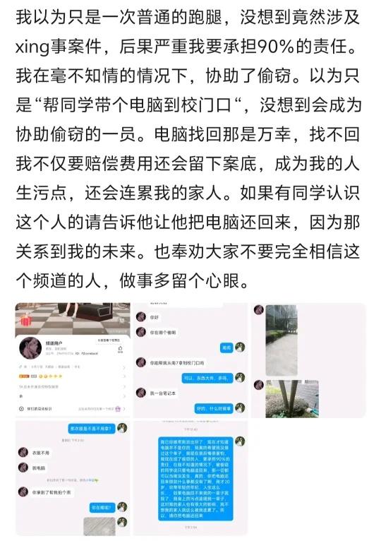 楼主帮人跑腿送电脑,结果电脑不是对方的,是偷来的,楼主成了帮凶,现在电脑已经没了,对方失踪不回消息,失主要求楼主赔偿7,8000,楼主已经大三了,快要毕业了,想问问有什么办法可以帮助楼主万能的小红薯 万能的 万能的小红🍠 万能的帮帮我 万能的红薯 万能的网友 万能 有问必答 有问必回