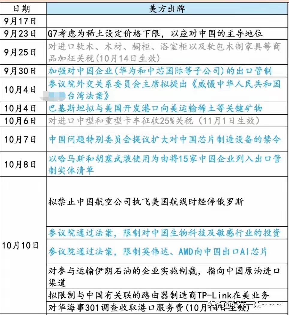 瞧瞧下图这张表格! 美国“屁股”被打疼了,还怪别人?都是自己先出牌,没事找事,结果他出个小王,我出个大王,一给他“卡脖子”就受不了,怨天喊地的,最后搞得正着说反着说都是他的道理!这不是活该是什么呢? 其实,我也很纳闷,为什么前面几轮中美经贸谈判都谈得不错?怎么突然一下子升级了。 从图中就可以看出是从9月23号就开始了。美国在后面怂恿,让欧洲在稀土上开条件,结果你一张牌我一张牌的就升级了。 解铃还须系铃人,反正特朗普政府现在也改口了,说还可以谈,毕竟所提出来的加征100%关税是在11月份实行,这不就是老套路出牌吗?又想在APEC会议期间讨要点筹码而已,很显然,这次没有那么容易了,不信走着瞧…
