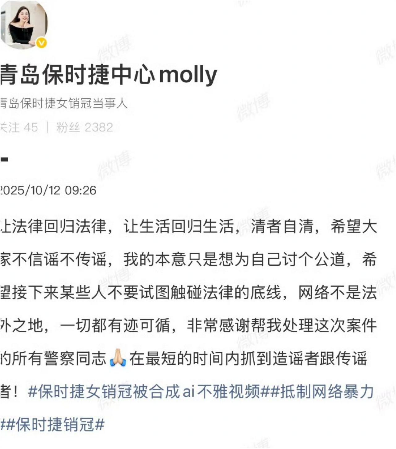 最新消息,10月12日,青岛保时捷女销冠于社交平台再度发文,晒出青岛市公安局李沧