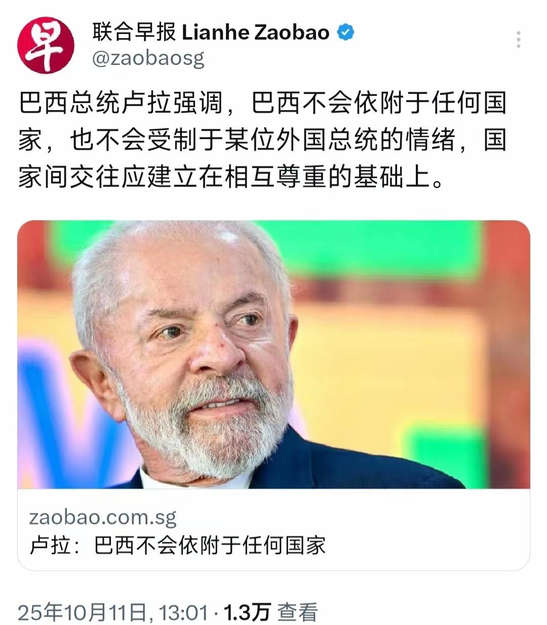 卢拉:巴西不会依附于任何国家 据新加坡联合早报10月11日报告:“巴西总统卢拉
