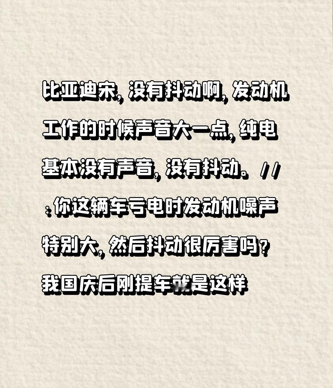 比亚迪宋没有抖动问题。发动机运转时,声音会稍大一些,不过纯电状态下基本没声音,也不会抖动。 //:你这辆车亏电时,发动机噪声是不是特别大,而且抖动很厉害?我国庆后刚提的车就是这种情况。